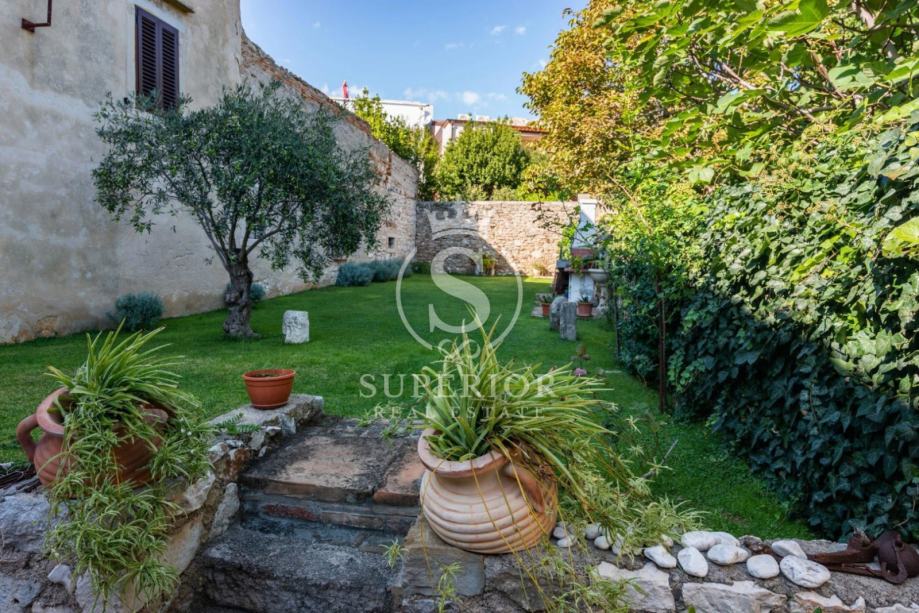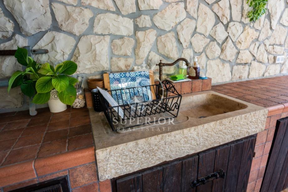 Posebnu vrijednost ovoj nekretnini daje prostrani privatni vrt od 182 m² te velika, djelomično natkrivena terasa od 50 m² – idealna za ljetna druženja, jutarnju kavu ili opuštanje u hladu. Na terasi se nalazi šterna s izvorom pitke vode, autentičan detalj koji dodatno naglašava mediteranski karakter nekretnine.