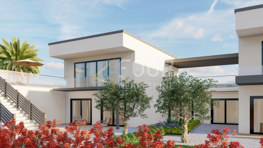 U dvorištu je predviđen bazen od 25 m2 sa sunčalištem, jacuzzijem i vanjskim stubištem koje povezuje glavni dio kuće sa suterenskim prostorima. Vila je opremljena termo izoliranom fasadom, ravnim krovom, PVC stolarijom, klima uređajima i podnim grijanjem na struju. Svakoj jedinici pripadaju dva parkirna mjesta.
