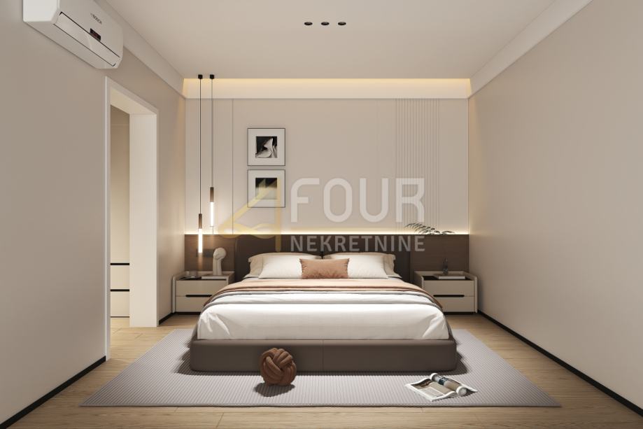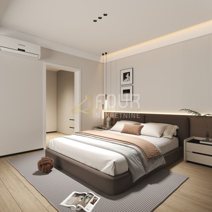 U suterenu se nalazi trosoban stan u kojem jedna spavaća soba ima vlastitu garderobu i status master sobe, dok su preostale dvije spavaće sobe smještene uz dodatnu kupaonicu i spremište. Iz svake sobe omogućen je izlaz na prostranu terasu. U prizemlju je smješten atraktivan open-space dnevni dio s kuhinjom i blagovaonicom, ulaznim prostorom, toaletom te stepeništem koje vodi na krovnu terasu površine oko 60 m2, idealnu za opuštanje i stvaranje dodatne lounge zone.