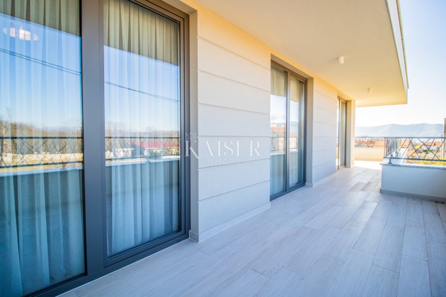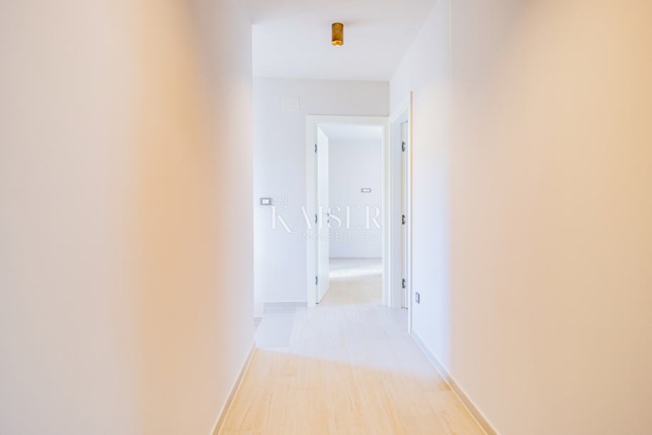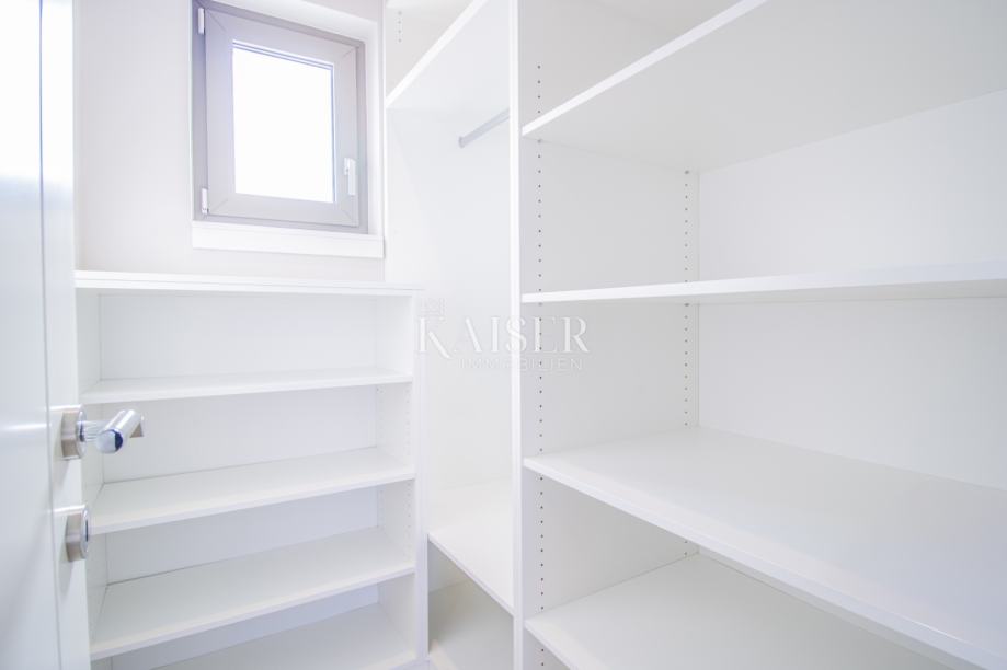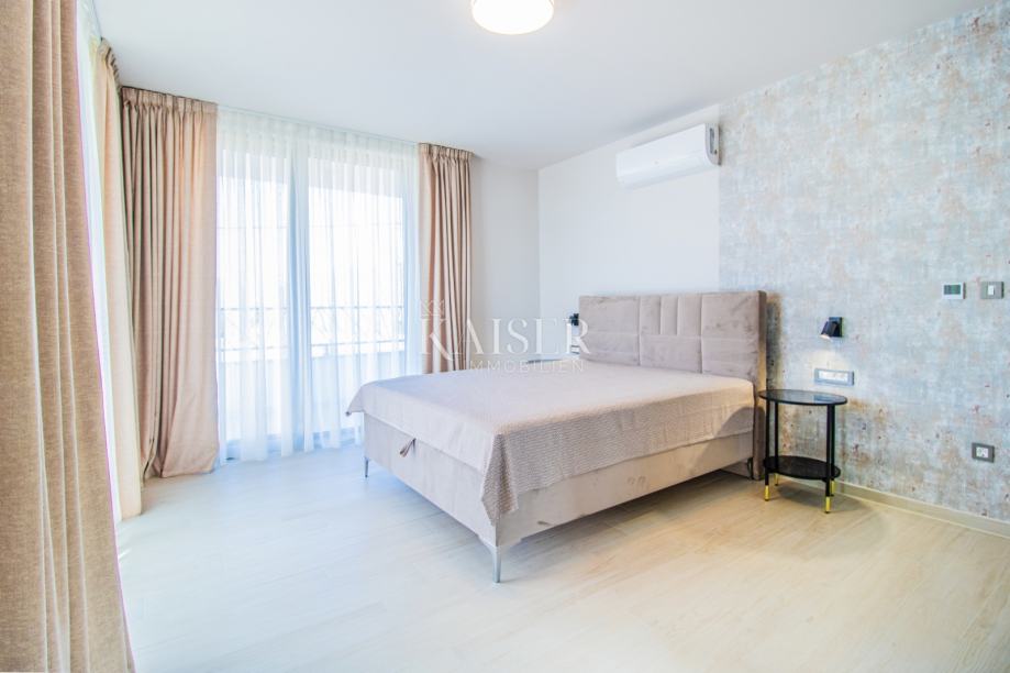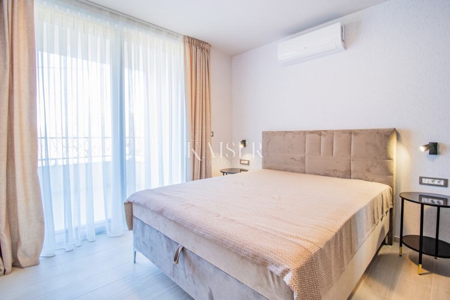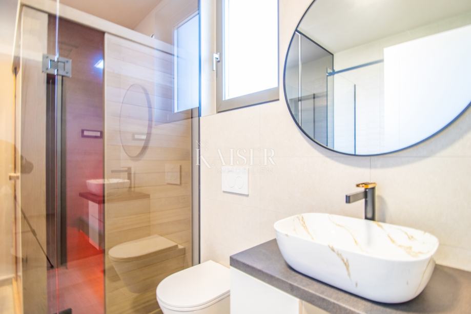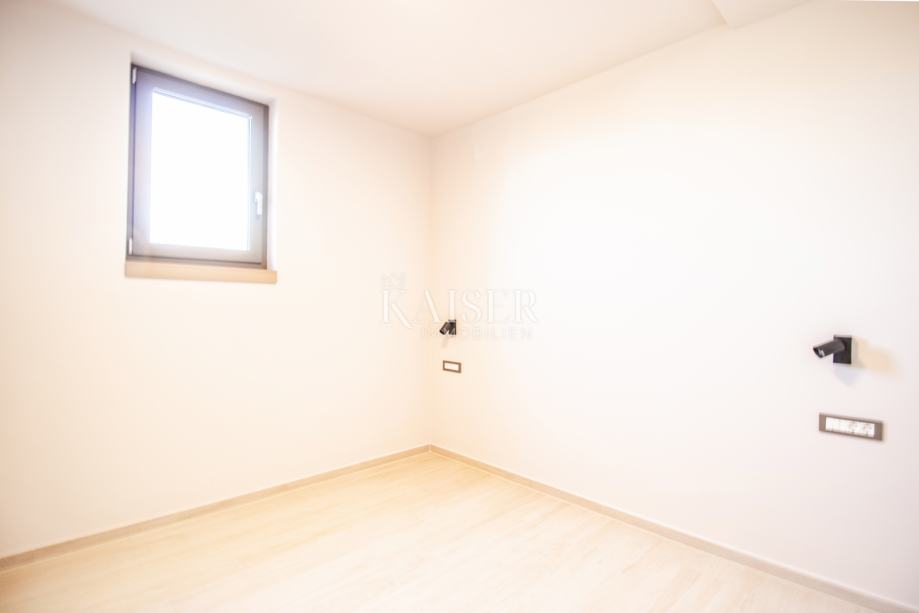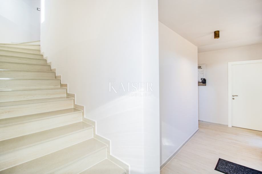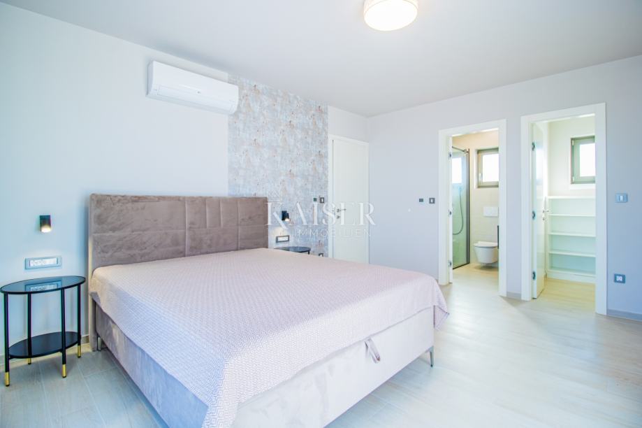 Objekt ukupne je površine 212,99m2, a prostire se na dvije etaže. U prizemlju se uz ulazni prostor nalazi dnevni prostor otvorenog koncepta površine 38m2, gostinjska spavaća soba sa vlastitom kupaonicom, dva spremišta, sauna i wc. Iz boravka se izlazi na prostranu natkrivenu terasu površine 30m2. Na katu, do kojeg se dolazi unutarnjim stubama, smještene su još tri spavaće sobe sa izlazima na natkrivenu terasu i panoramskim pogledom na more i otok Cres. Glavna spavaća soba ima garderobu i vlastitu kupaonicu, a na katu je i dodatna kupaonica.