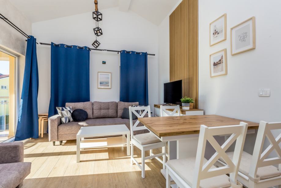 Interijer apartmana odiše svježinom i funkcionalnošću. Sastoji se od dvije udobne spavaće sobe, moderne kupaonice, praktične ostave te prostranog dnevnog prostora koji uključuje kuhinju, blagovaonicu i dnevni boravak u otvorenom konceptu. Najveći adut apartmana je natkrivena terasa s otvorenim pogledom na more – savršena za jutarnju kavu ili večernji odmor uz zalazak sunca.