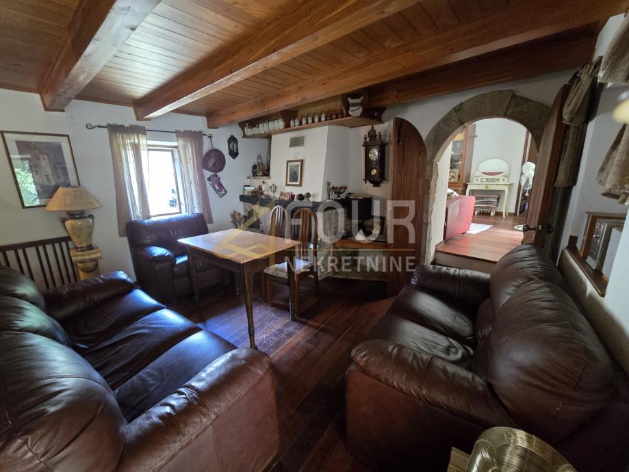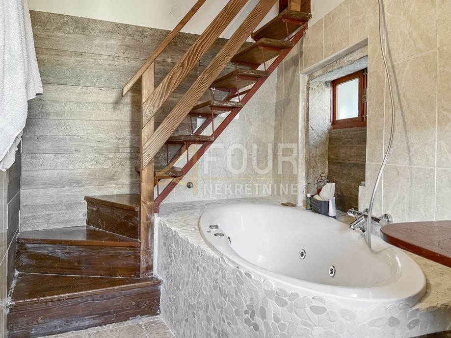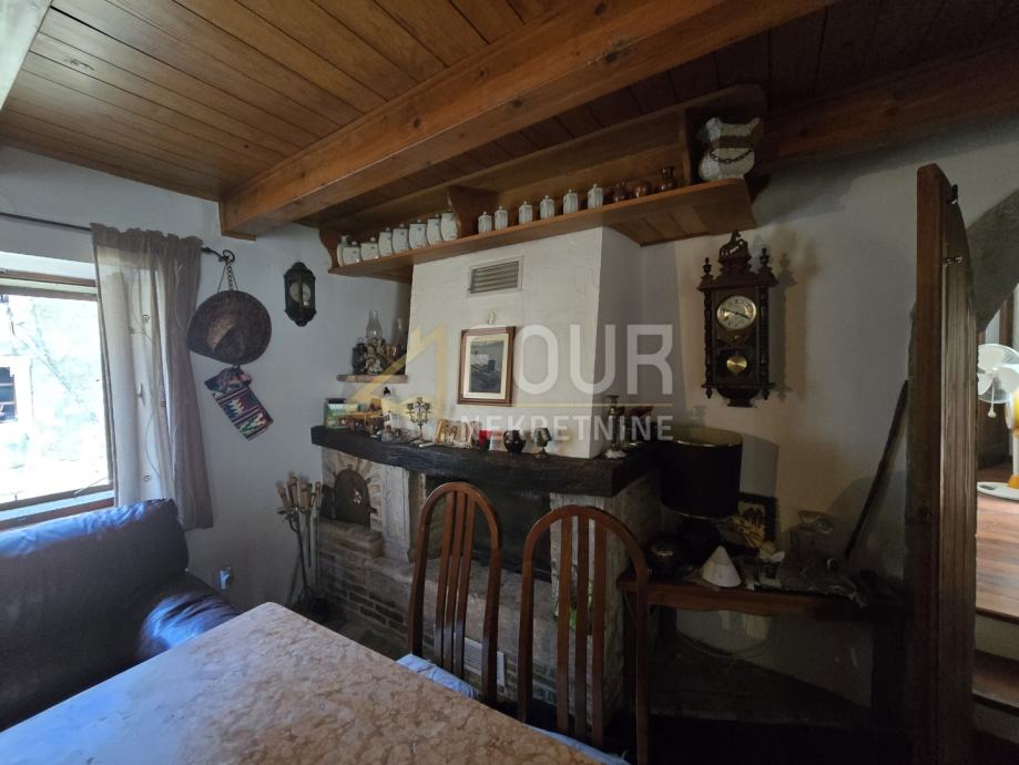 Dodatnu toplinu i ugođaj daje kamin, dok drvena stolarija doprinosi rustikalnoj atmosferi i autentičnom šarmu kuće.