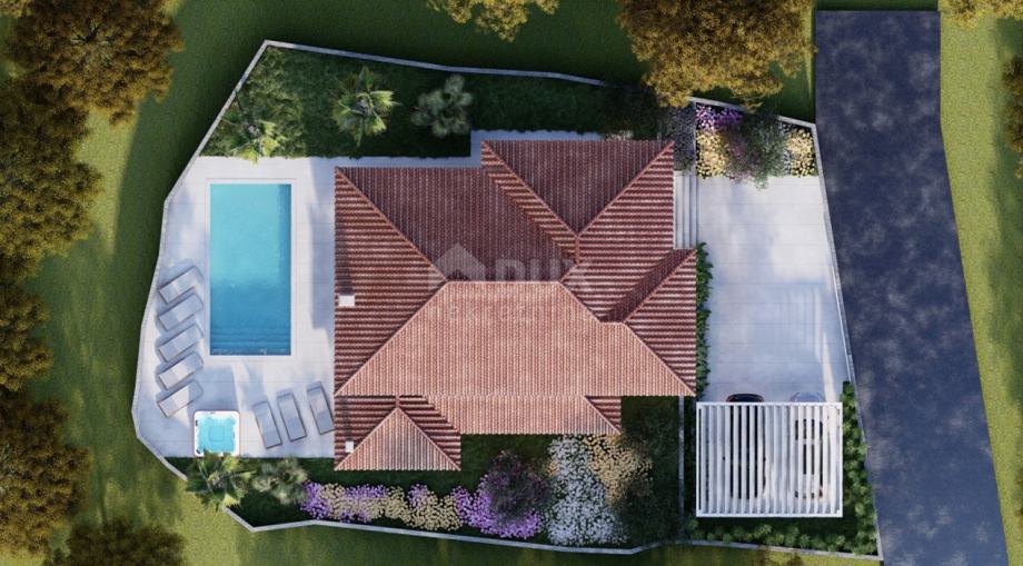 Kuća se prostire na parceli od 651 m2 i obuhvaća dvije etaže s ukupno 251 m2 stambenog prostora. U prizemlju se nalazi ulazni prostor, vešeraj, toalet, spavaća soba s vlastitom kupaonicom, moderna kuhinja s blagovaonicom i prostrani dnevni boravak koji vodi na natkrivenu terasu i uređenu okućnicu. Na prvom katu smještene su tri prostrane spavaće sobe, svaka sa svojom garderobom i kupaonicom, dok dvije sobe dijele zajedničku terasu s prekrasnim pogledom na more.