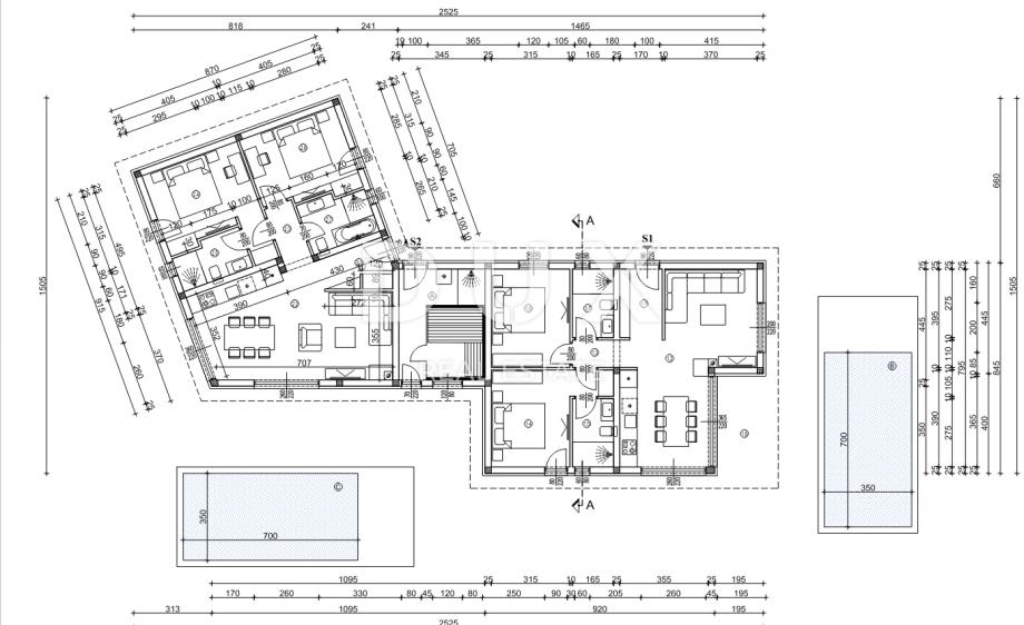 Projekt podrazumjeva prizemnicu sa dvije samostalne stambene jedinice sa dva bazena i garažom. Moguća je izmjena odnosno dopuna građevinske dozvole i dizanje dodatno kata.