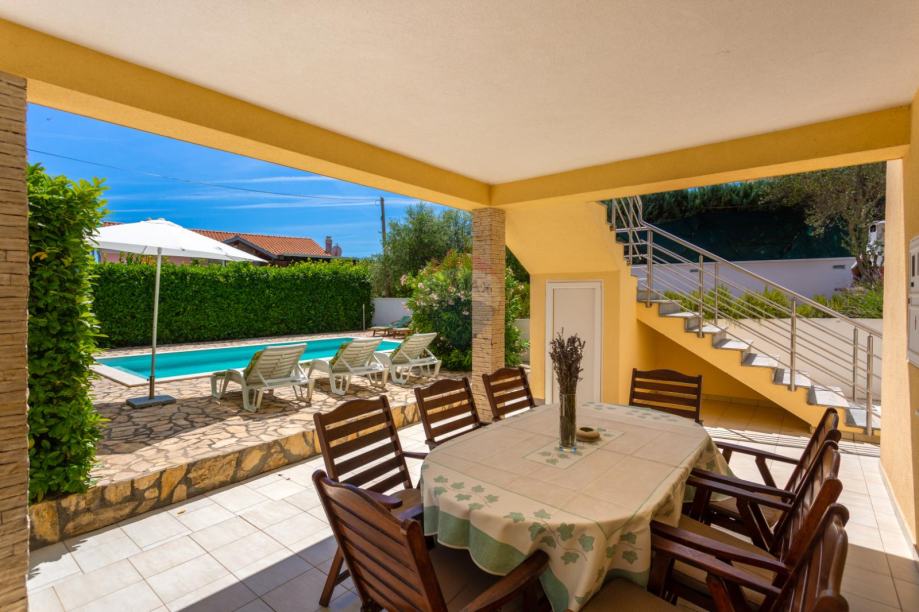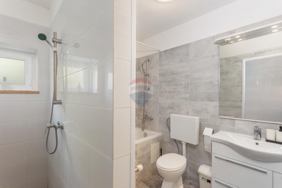 U prizemlju se nalazi stan koji se sastoji od prostrane kuhinje s blagovaonicom, udobnog dnevnog boravka, kupaonice, tri prostrane spavaće sobe, kotlovnice te terase s prekrasnim pogledom na more. Također, u prizemlju postoji mogućnost stvaranja zasebnog studio apartmana s posebnim ulazom, pružajući dodatnu priliku za iznajmljivanje ili goste.