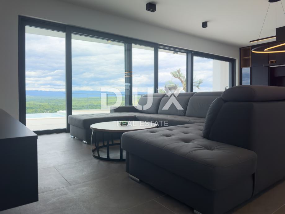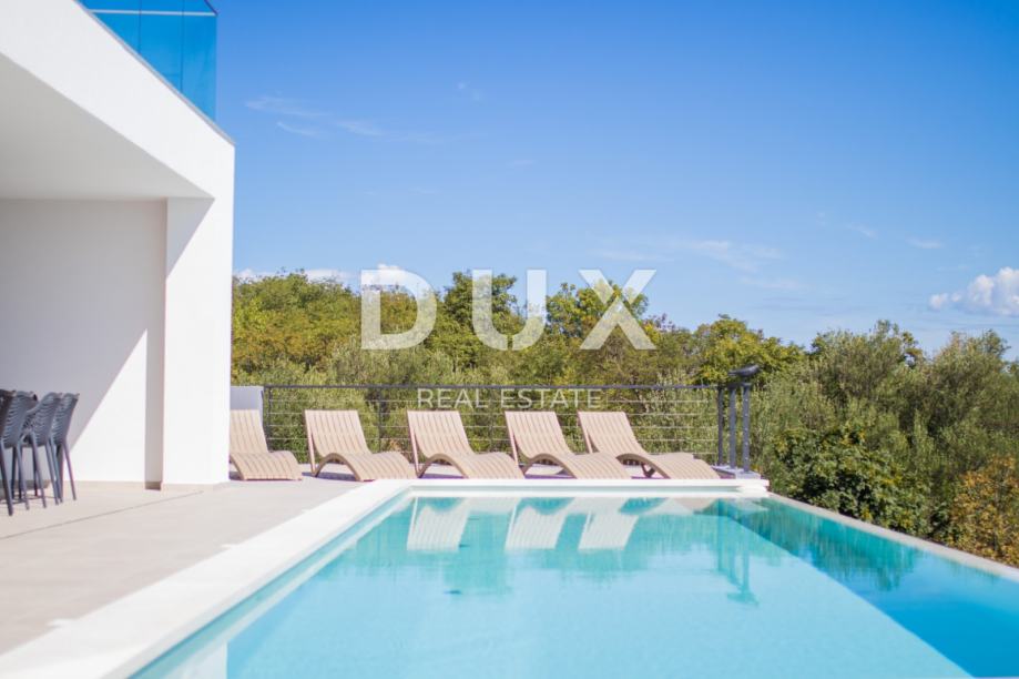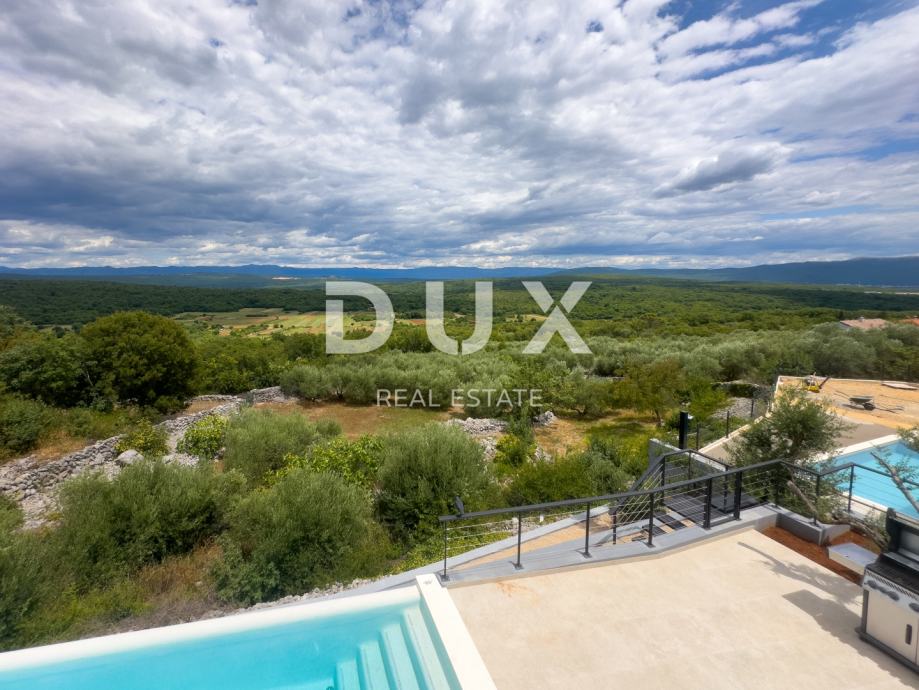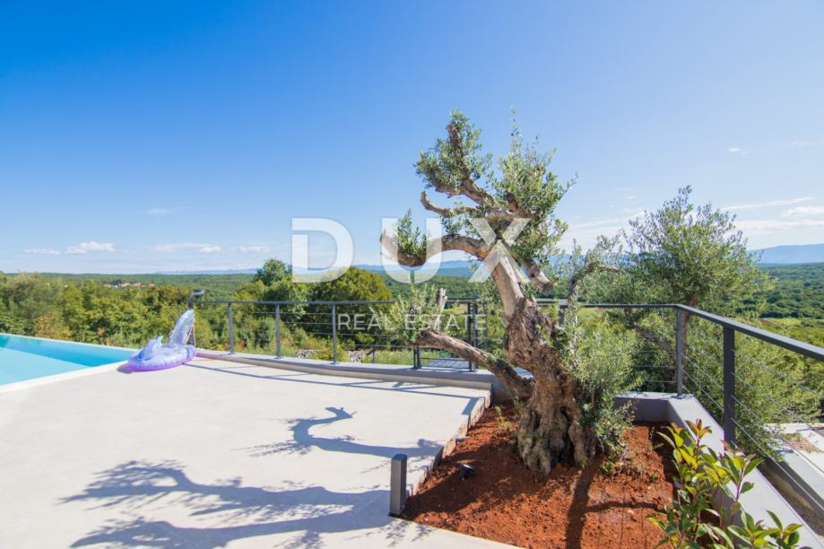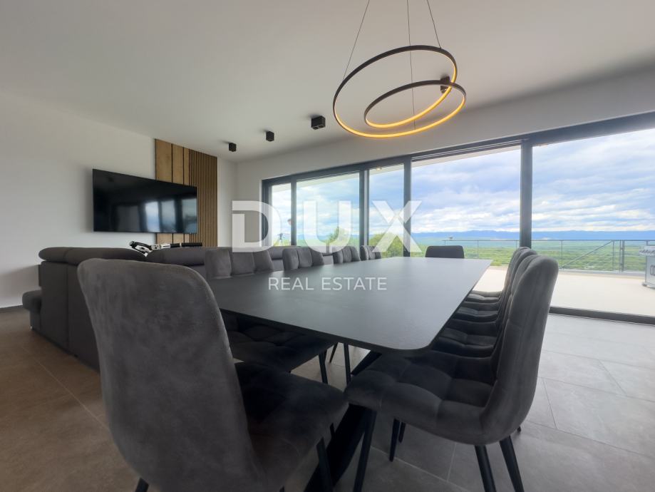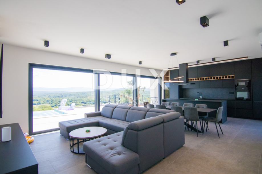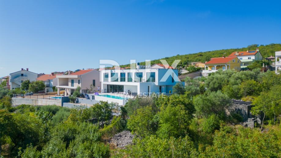 Ova prekrasna moderna vila sagrađena je na parceli od 730 m2 i nalazi se nedaleko grada Krka uz sam rub građevinske zone na uzvišenom položaju koji garantira panoramski pogled zauvijek.