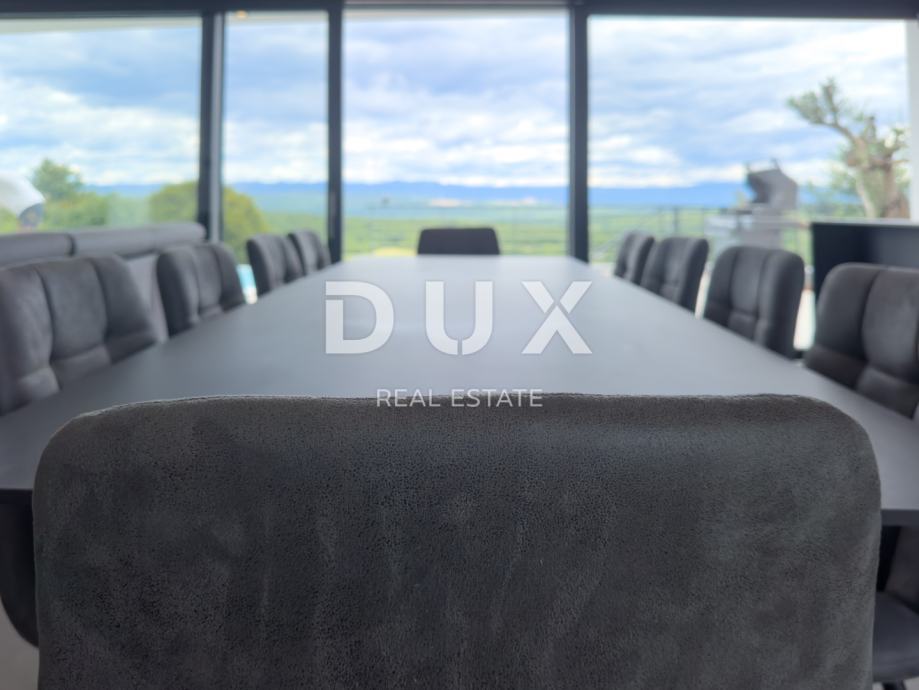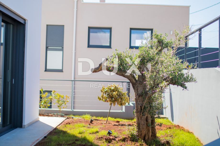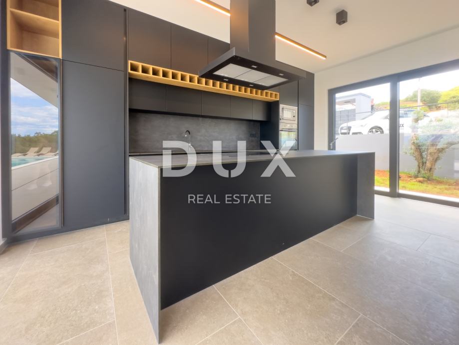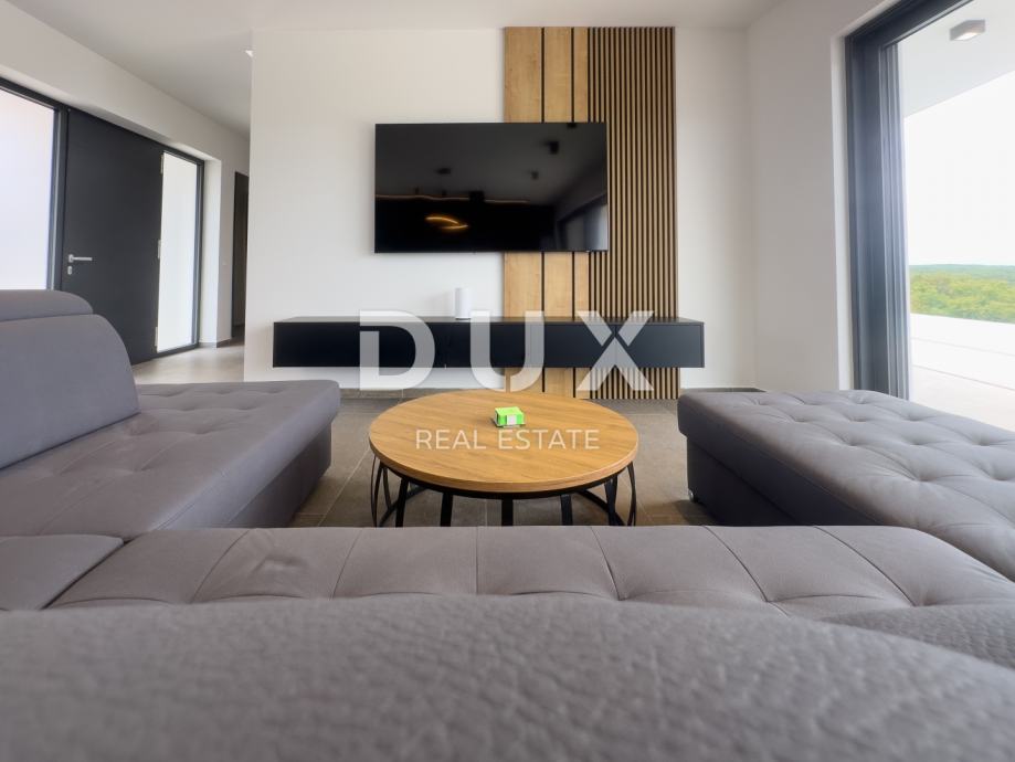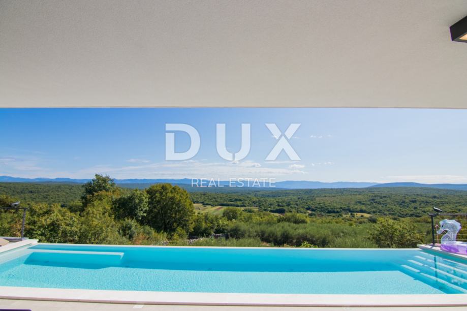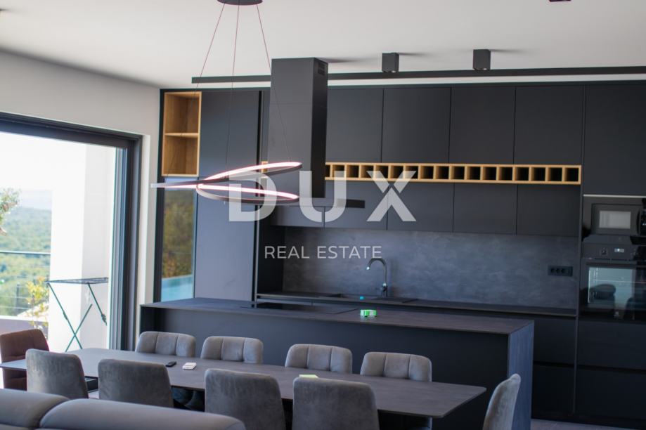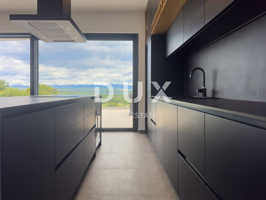 Ova prekrasna moderna vila sagrađena je na parceli od 730 m2 i nalazi se nedaleko grada Krka uz sam rub građevinske zone na uzvišenom položaju koji garantira panoramski pogled zauvijek.