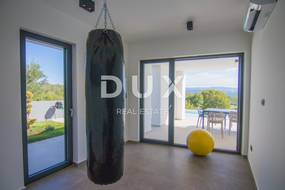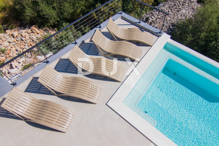 U prizemlju vile nalazi se garaža, vešeraj sa spremištem, kupaonica, prostorija za vježbanje, kuhinja s blagovaonicom i dnevnim boravkom iz kojih se izlazi na lijepo uređenu okućnicu na kojoj se nalazi preljevni bazen, sunčalište, natkrivena terasa i roštilj. Na katu se nalaze četiri spavaće sobe svaka sa svojom kupaonicom od kojih tri sobe imaju izlaz na balkon s kojeg se pruža prelijepi pogled na okolnu prirodu i more.