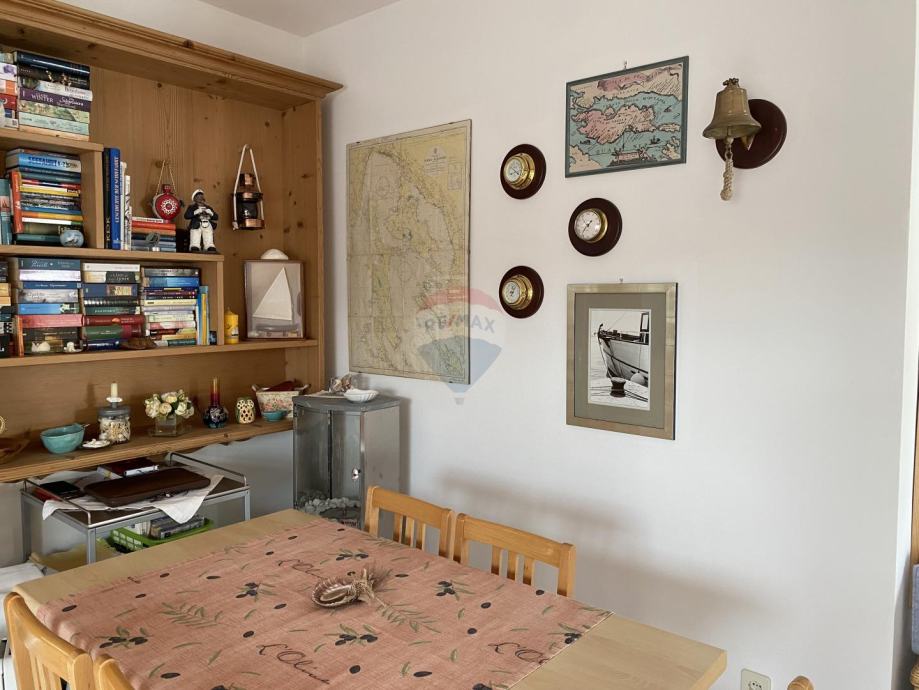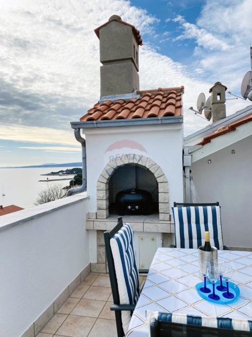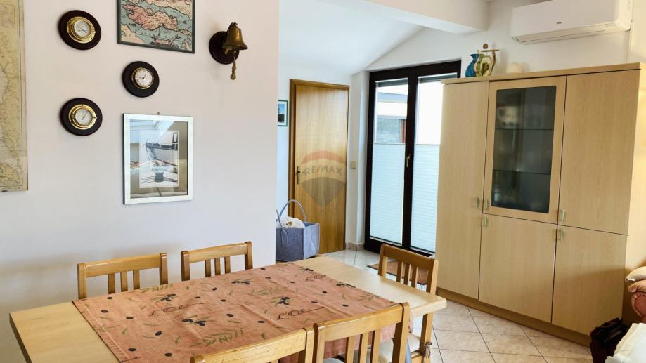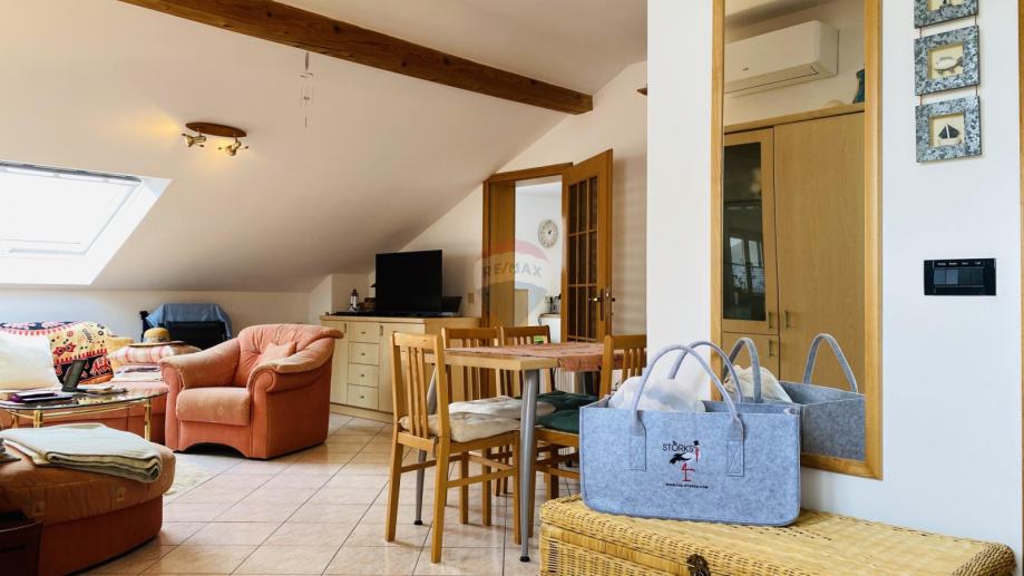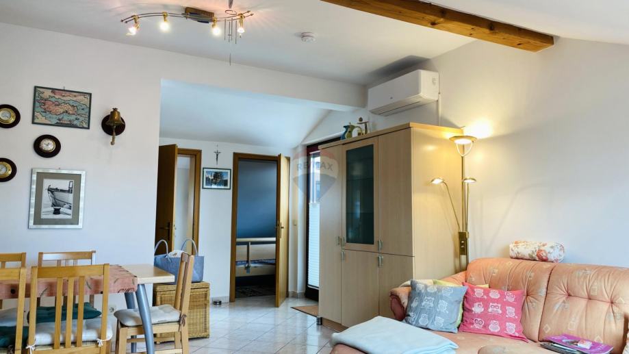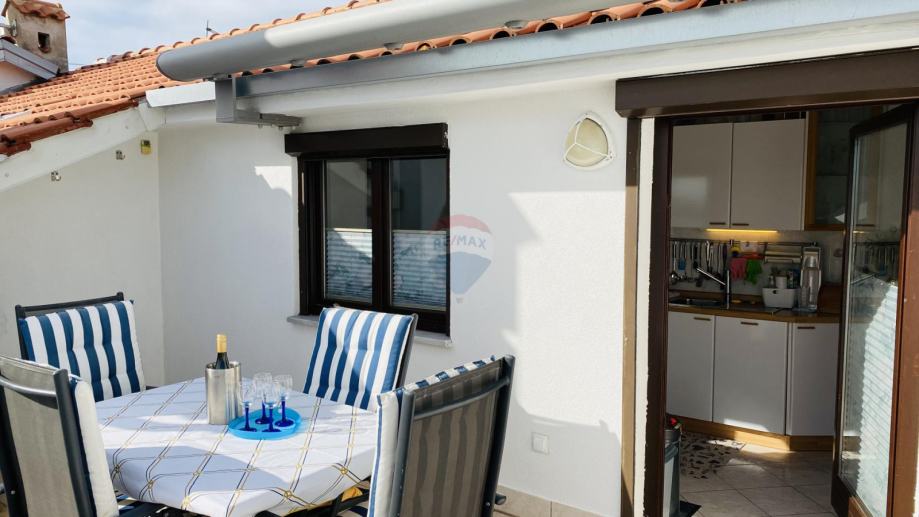 Prekrasan penthouse s garažom na prestižnoj lokaciji u Gradu Krku. Ovaj jedinstven stan smješten je u samoj blizini centra, svega 130 metara od plaže, te ga krasi spektakularni pogled na more kao i očaravajući panoramski prikaz stare jezgre Grada Krka. Njegova površina iznosi 82 m2, te se sastoji od kuhinje, dnevne sobe i blagovaonice, kupaonice, dvije spavaće sobe, balkona i terase s roštiljem. Stanu pripada i garaža površine 19 m2 te vanjsko parkirno mjesto.