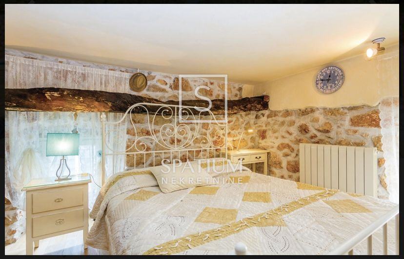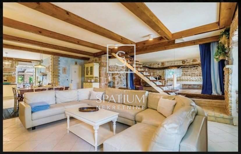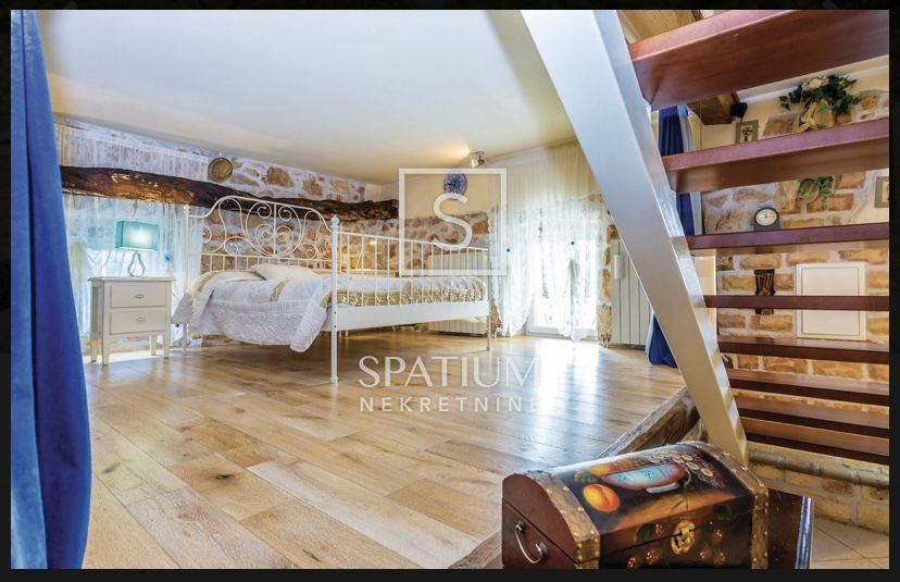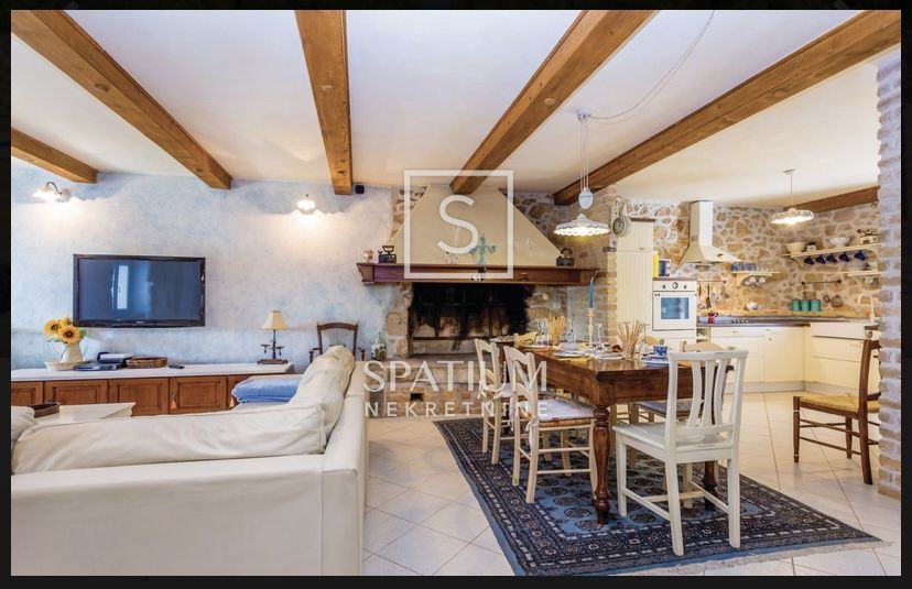 Nekretnina se sastoji od otvorenog dnevnog prostora s kuhinjom i blagovaonom, četiri spavaće sobe i dvije kupaone. U prizemlju kuće je konoba u kojoj se nalazi stoljetni stari mlin za masline. Na velikoj okućnici nalaze se bazen sa sunčalištem, natkrivena vanjska terasa i četiri parkirna mjesta.