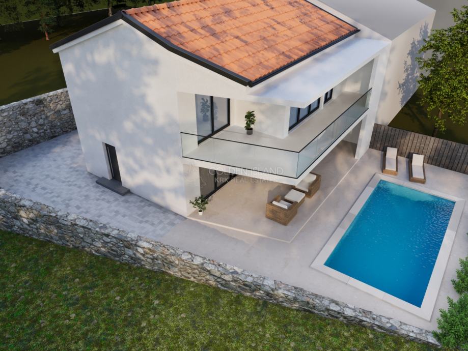 Otok Krk, Klimno, prodaje se dvojna kuća u izgradnji. Sastoji se od prizemlja i kata. U prizemlju će biti dnevni prostor od 48 m2 koji uključuje dnevni boravak, kuhinju i iblagavaonicu. Iz istog se izlazi na terasu površine 28 m2. U prizemlju se nalazi i jedna spavaća soba sa kupaonicom, jedan WC za goste , spremište od 7m2 te stepenište na kat gdje se nalaze tri spavaće sobe svaka sa svojom kupaoonicom te zajednički boravak na katu iz kojeg se izlazi na terasu.