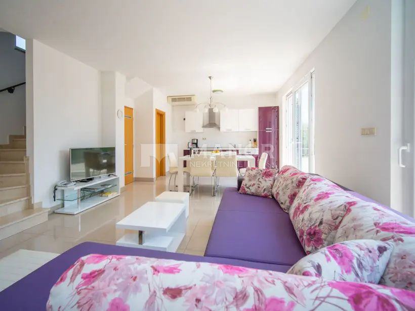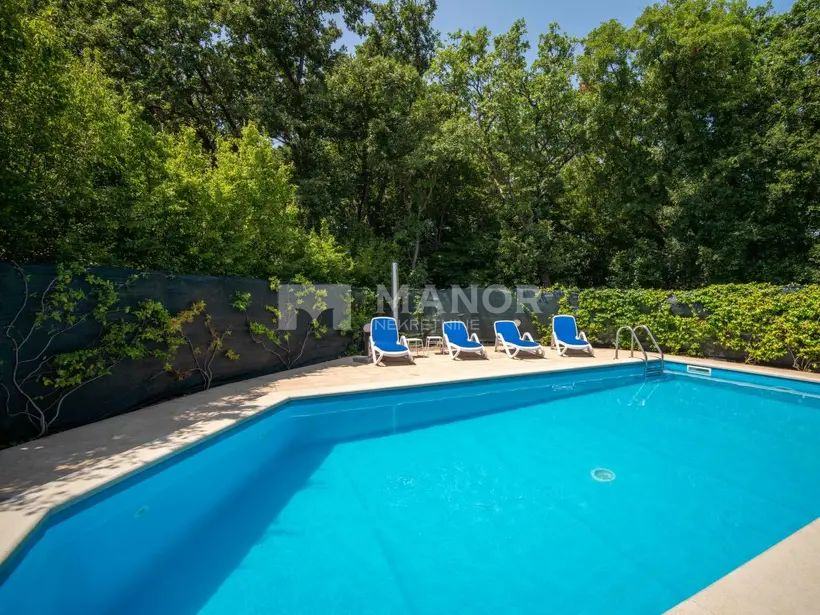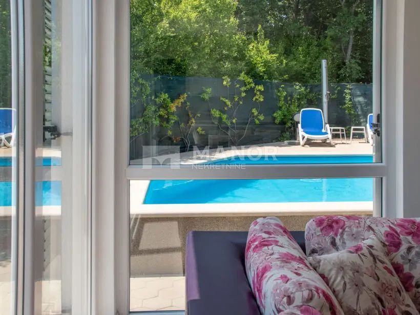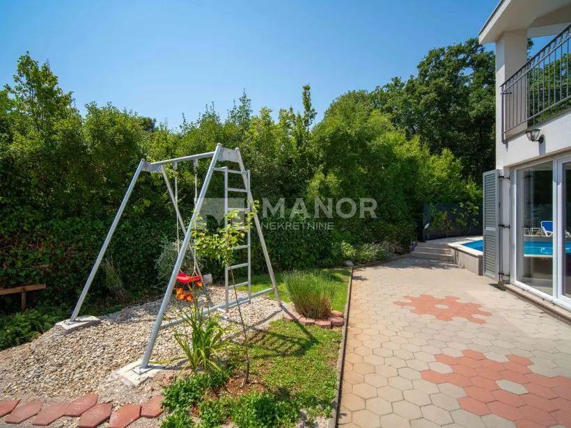 Također, okućnica sadrži terasu, grijani bazen površine 32 m2, sunčalište i roštilj, kao i prostor za djecu.