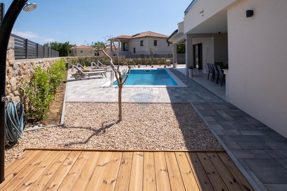 Na okućnici se nalazi bazen s sunčalištem i prostorom za druženje, roštilj zona (ljetna kuhinja) te dva parkirna mjesta.