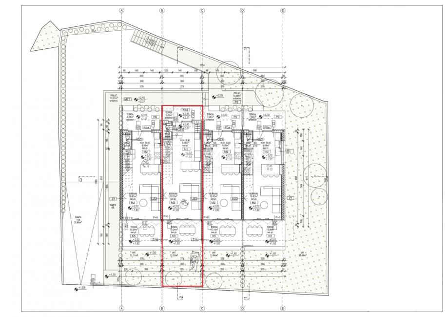 U prizemlju se nalazi ulazni prostor, kuhinja s blagovaonicom, dnevni boravak, wc, stubište, natkrivena terasa 5m2, natkrivena terasa 10m2