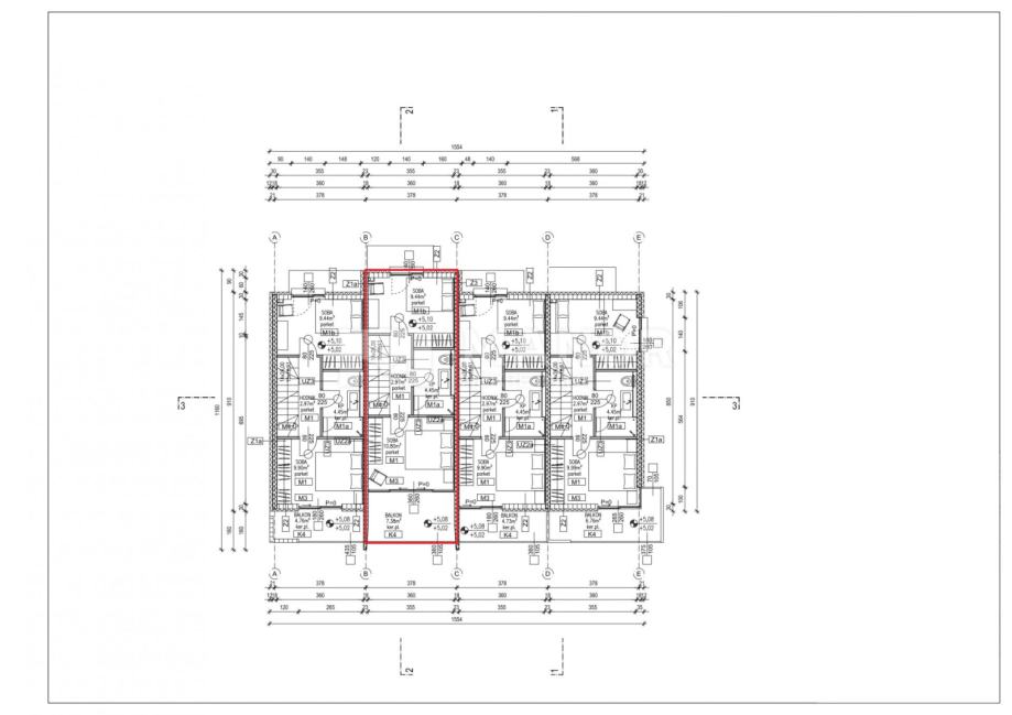 s izlazom na vrt od 13m2. Na prvom katu nalazi se hodnik, dvije spavaće sobe, kupaonica i balkon od 7,38 m2.
