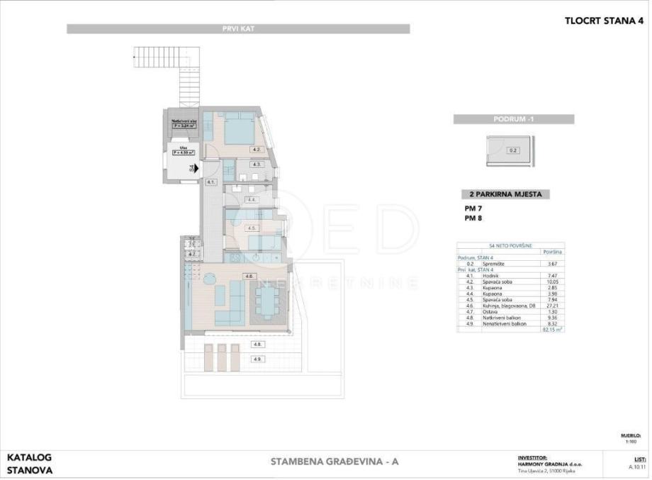 Stan će biti opremljen stropnim zvučnicima, LED rasvjetom u dnevnom boravku i električnim roletama te aluminijskom stolarijom.