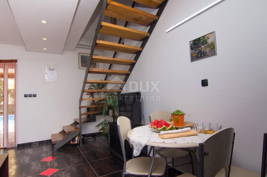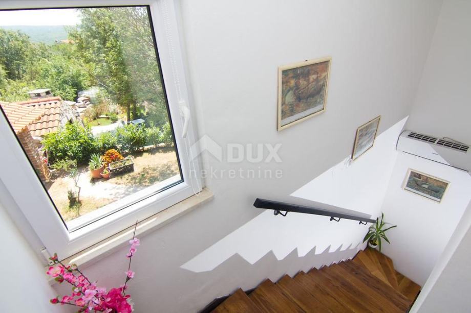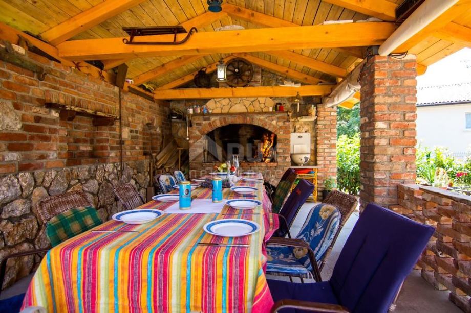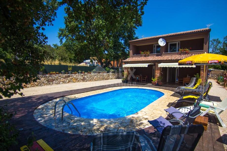 Kuća s bazenom na mirnoj lokaciji na otoku Krku s pogledom na more. Sastoji se u biti od dva identična dvoetažna apartmana koji se prodaju kao cjelina. Svaki od njih sastoji se od dvije spavaće sobe, dvije kupaonice i dnevnog boravka s kuhinjom i blagovaonom, te ima gornju i donju terasu. Na velikoj okućnici nalazi se bazen sa sunčalištem, te zidani prostor oko roštilja sa stolom za veću grupu ljudi.