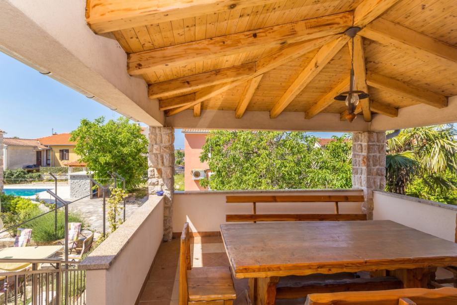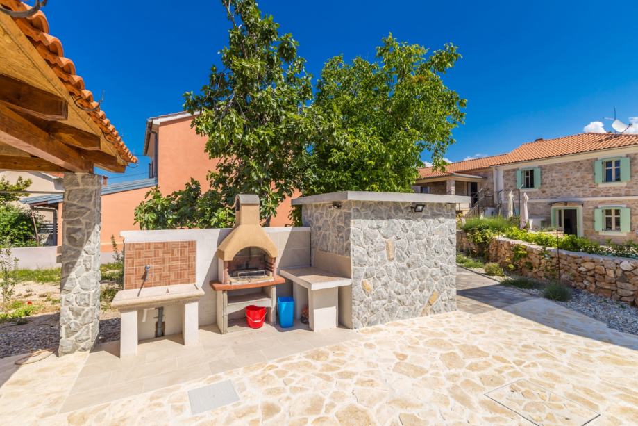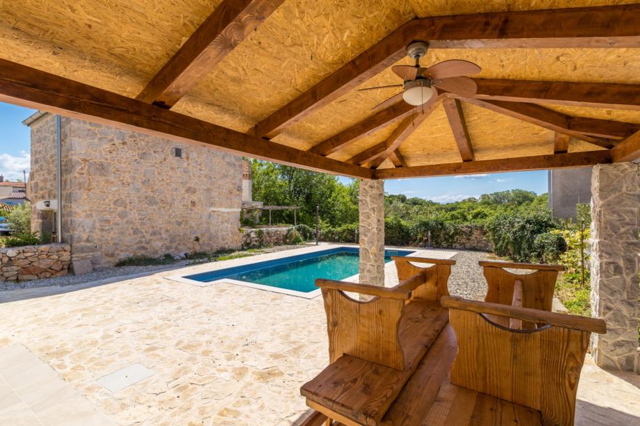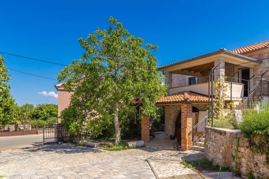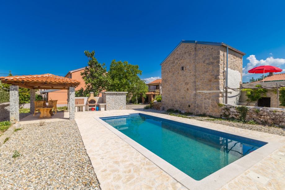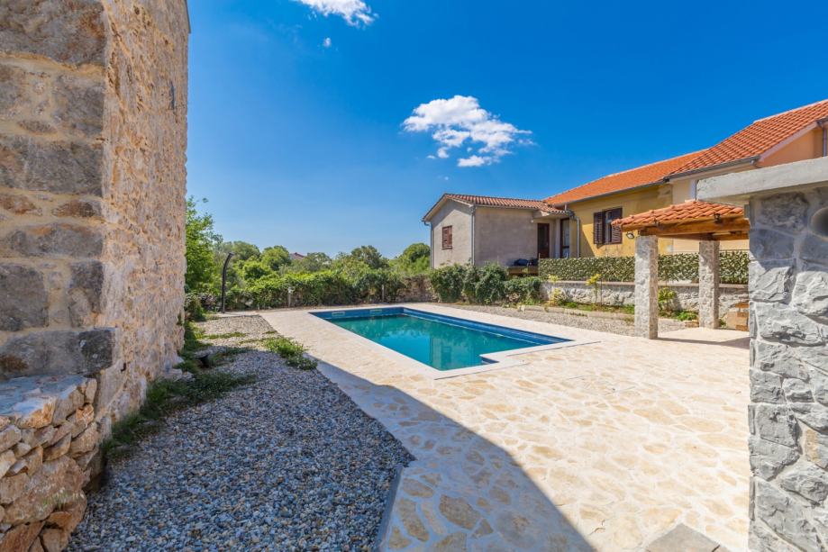 Na mirnoj lokaciji na otoku Krku prodaje se dvojna kamena kuća s prostranom okućnicom i privatnim bazenom, idealna za obiteljski odmor ili turistički najam.