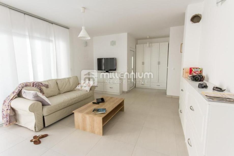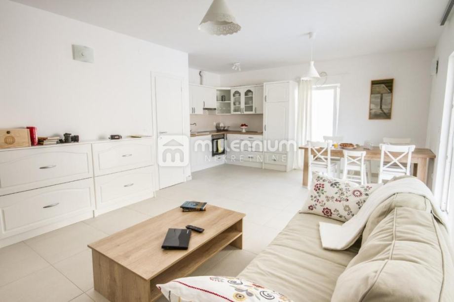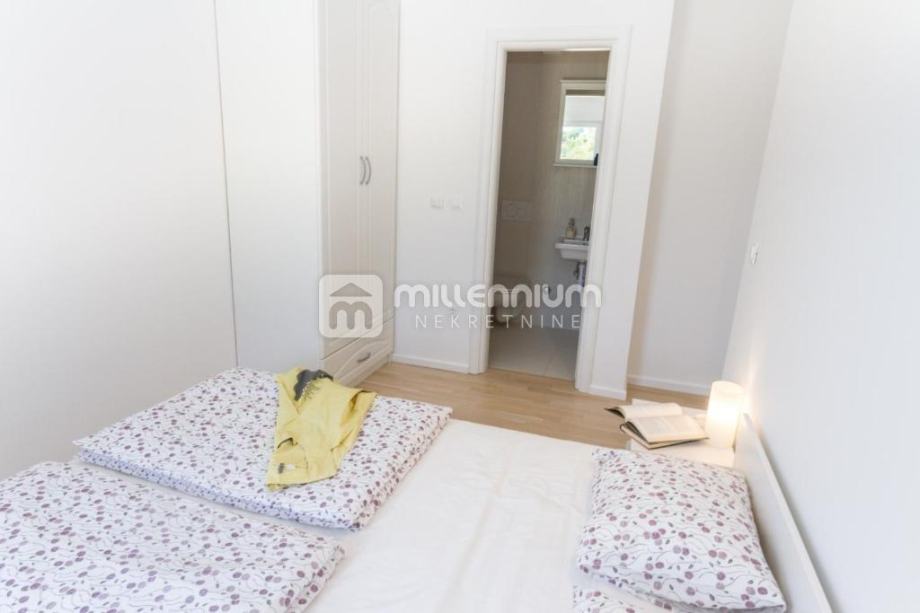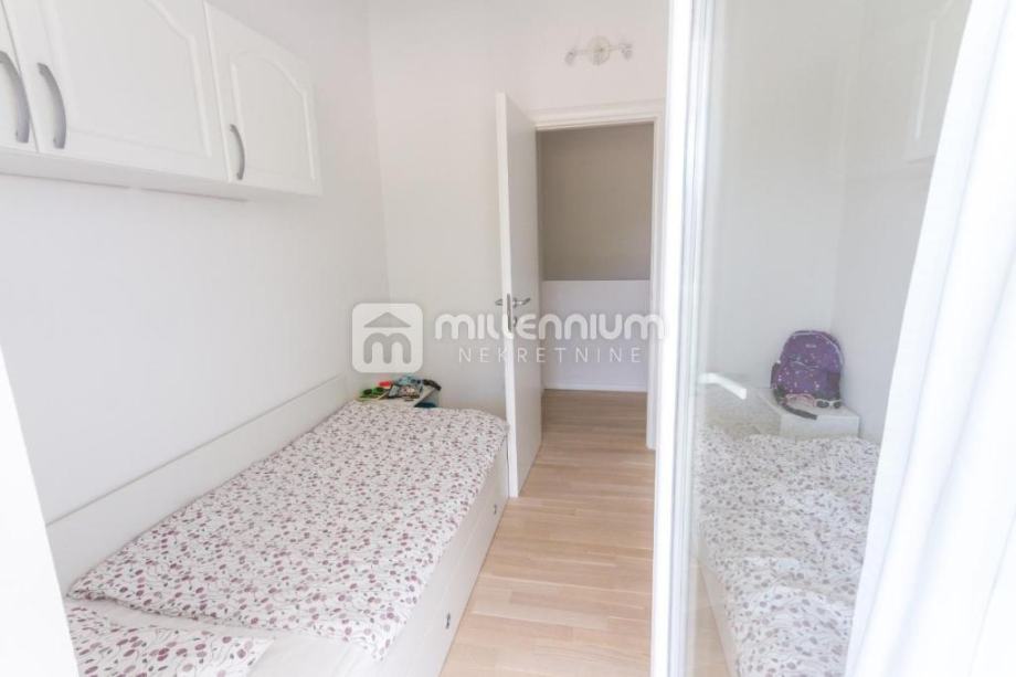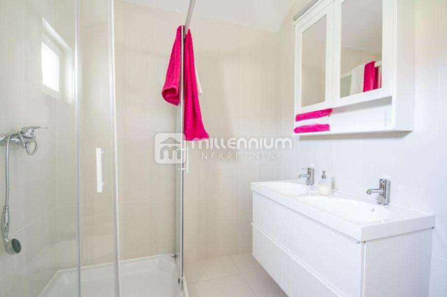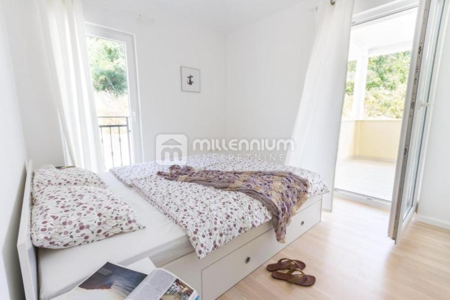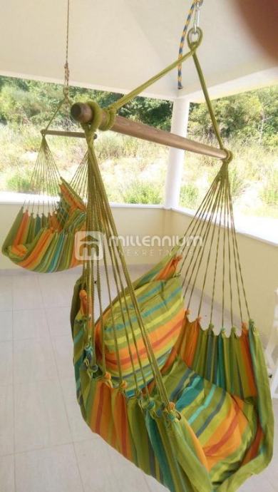 Kuća je izgrađena 2014.godine, kvalitetno je uređena i opremljena (podno grijanje, klima, solarni tuš) te je koncipirana kao dvoetažni prostor, P+1.