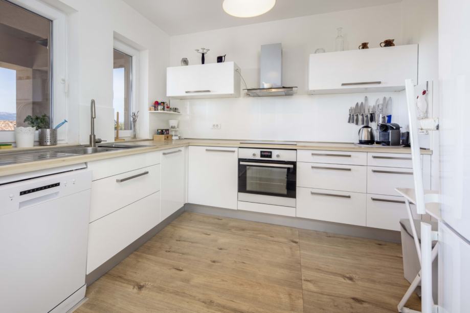 U prizemlju se nalazi vinski podrum, garaža, kupaonica, spremište te natkrivena terasa s opremljenom ljetnom kuhinjom – savršeno mjesto za opuštanje i druženje tijekom toplih mjeseci. Na prvom katu smještene su tri udobne spavaće sobe, dvije kupaonice, prostrani dnevni boravak povezan s kuhinjom i blagovaonicom, ostava te terasa s pogledom na more.