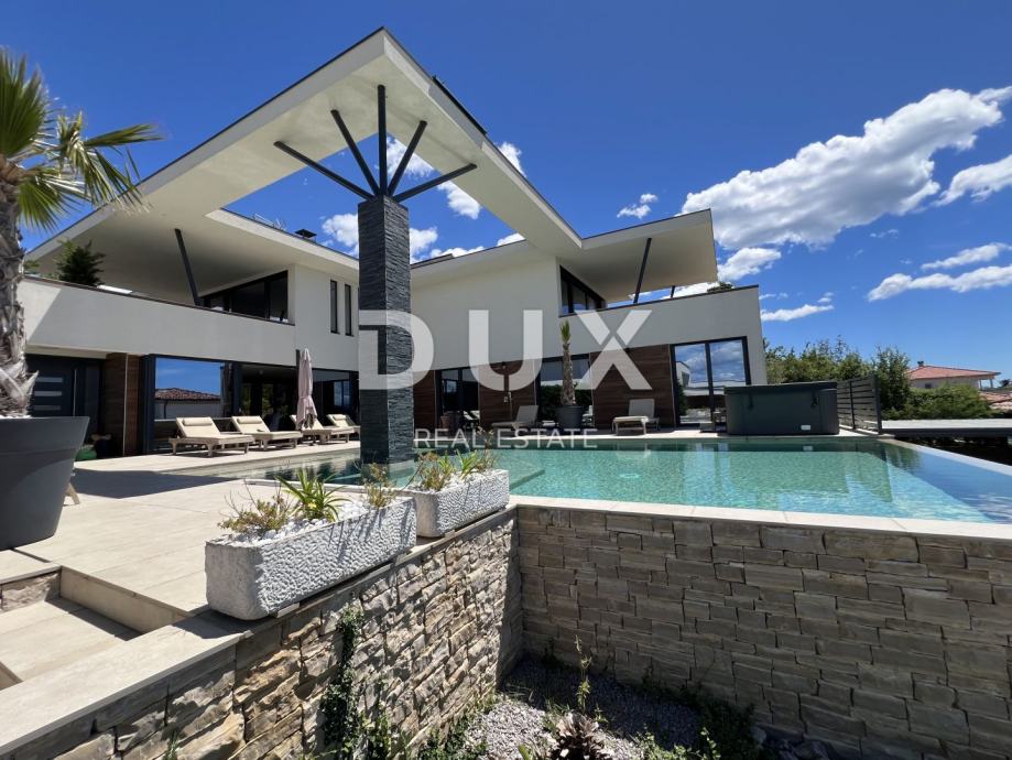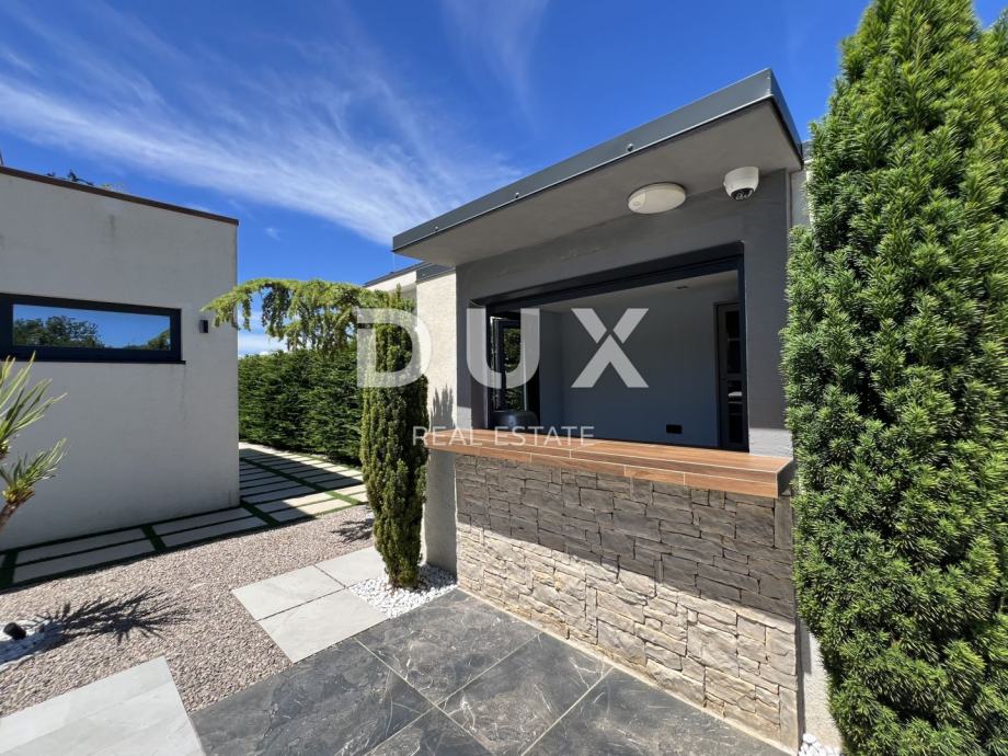 Na pažljivo uređenoj okućnici ističu se veliki infinity bazen s kaskadnim slapom s krova, jacuzzi, sunčalište te natkrivena terasa s vanjskom blagovaonicom, ljetnom kuhinjom, roštiljem i vinskim podrumom.