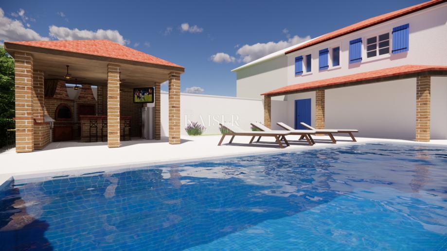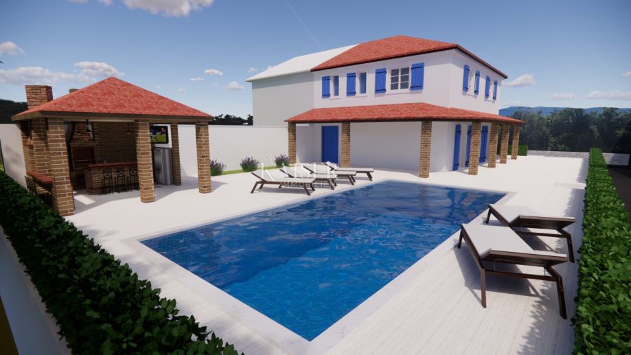 Objekt je smješten na okućnici površine 501m2, na kojoj se nalazi bazen površine 24m2 sa sunčalištem, potpuno natkrivena ljetnja kuhinja sa kaminom, te 4 parkirna mjesta.