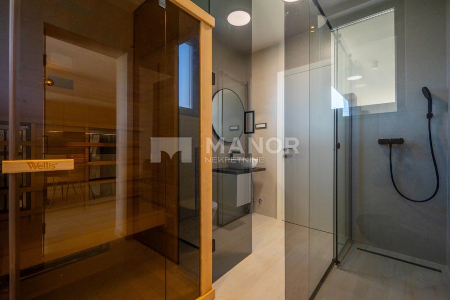 blagovaonicom i dnevnim boravkom, spavaća soba s vlastitom kupaonicom, toalet, spremište, sauna, dva