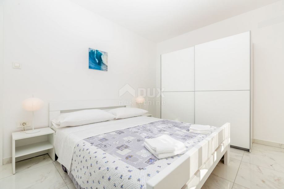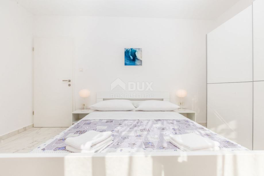 U prizemlju se nalazi natkrivena terasa ulaznog dijela, ulazni hodnik, kuhinja s blagovaonicom i izlazom na bočnu terasu, dnevni boravak s pogledom na bazen, spavaća soba s vlastitom kupaonicom te gostinjski toalet. Unutarnje stubište vodi na kat gdje su smještene tri spavaće sobe, s vlastitiom kupaonicama, dok dvije spavaće sobe imaju i izlaz na terasu s lijepim pogledom na more. Kupaonica u master sobi opremljena je kadom.