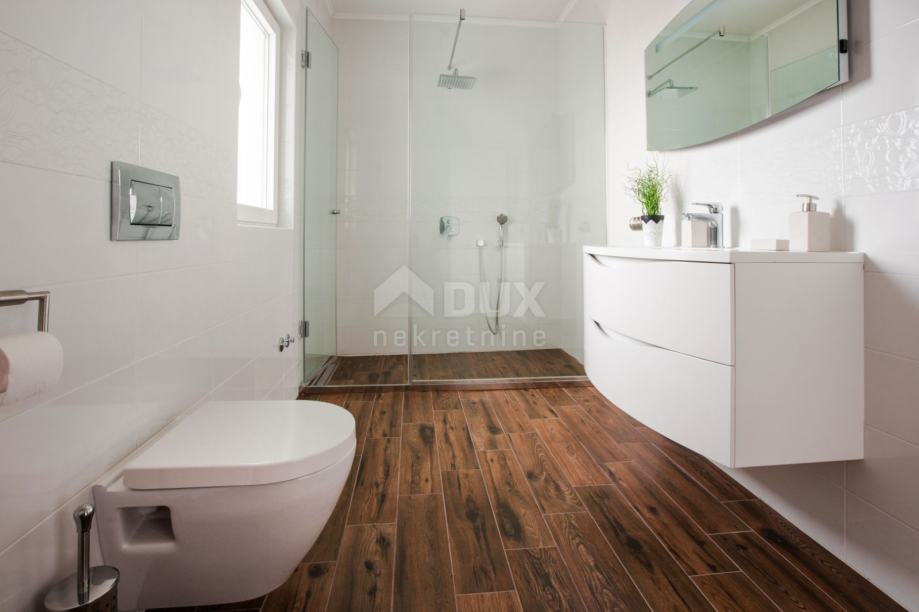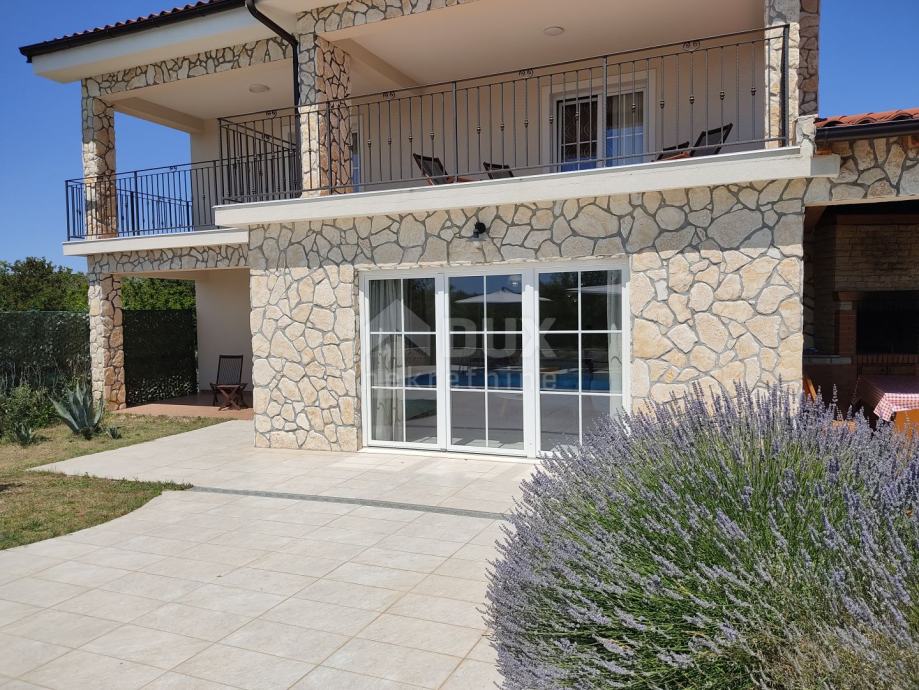 Ova lijepa kuća smjestila se oko 1600 m od mora na mirnoj lokaciji. Ima oko 250 m2 koji su se raspodijelili na tri etaže. U suterenu se nalazi prostorija za druženje i igru, a ovisno o želji može dobiti i neku drugu namjenu. U prizemlju se nalazi kupaonica, spavaća soba sa svojom kupaonicom, kuhinja s blagovaonicom i dnevni boravak iz kojih se izlazi na lijepo uređenu okućnicu s mediteranskim biljem na kojoj se nalazi bazen od 30 m2 sa sunčalištem, natkrivena terasa s roštiljem i spremište s vešerajem. Treba naglasiti da se s terase sunčališta vidi more. Na katu su se smjestile dvije velike spavaće sobe sa svojim kupaonicama iz kojih se izlazi na veliki balkon s panoramskim pogledom na more. Kuća ima solarne panele za grijanje vode.