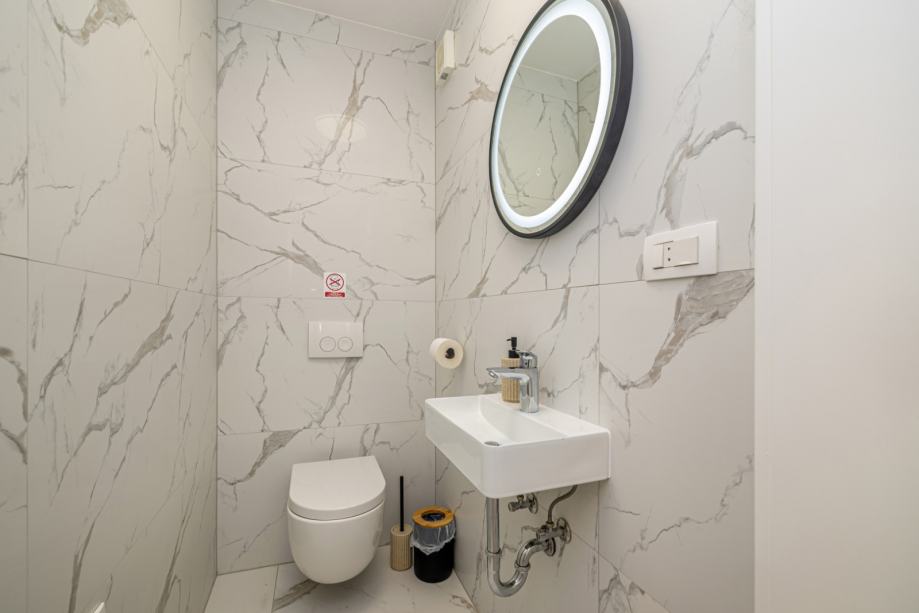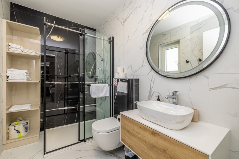 Interijer je osmišljen s pažnjom na detalje – tri prostrane spavaće sobe nude maksimalnu privatnost i ugodnu atmosferu. Glavna spavaća soba ima vlastitu luksuznu kupaonicu, dok druge dvije dijele moderno uređenu kupaonicu. Dodatni toalet osigurava dodatnu praktičnost, osobito kada imate goste.