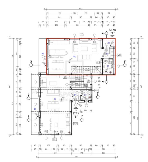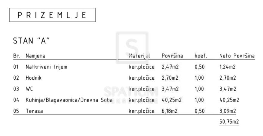 Prizemlje obuhvaća dnevni boravak otvorenog koncepta s kuhinjom i blagovaonicom, gostinjski WC te natkrivenu terasu s izlazom na okućnicu gdje se smjestio bazen sa sunčalištem kao idealno mjesto za opuštanje i druženje.