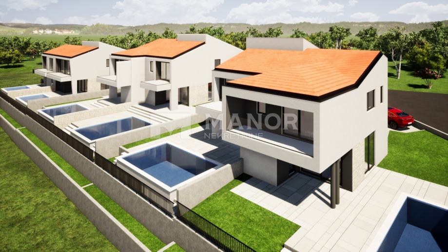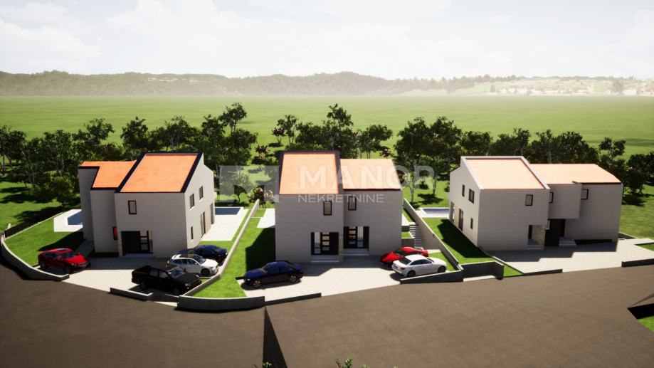 U sklopu okućnice nalaze se dva parkirna mjesta te bazen površine 24 m2. Kuća će biti opremljena