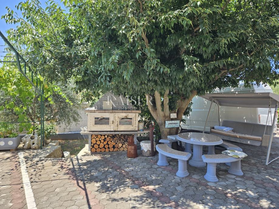 Na prostranoj okućnici ukupne površine 500m2 nalazi se i pomoćna prostorija za alat površine 38m2, te pušnica za sušenje mesa. U vrtu je 12 stabala maslina, 4 palme, te ostalo mediteransko raslinje. Također tu je i veliki vrtni kamin sa stolom i klupicama, koji se nalazi u prirodnom hladu stogodišnjeg stabla koprive. Dovoljno je prostora za izgradnju bazena i sunčališta. Kuća ima tri natkrivena parkirna mjesta, te još dodatnog prostora za parking.