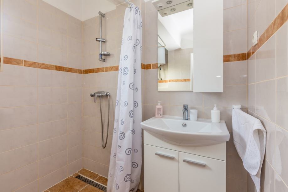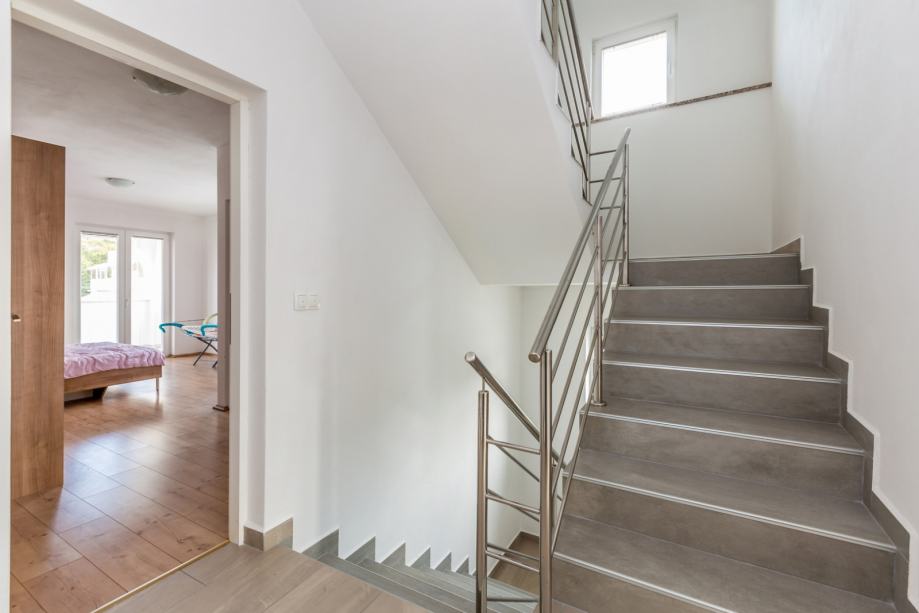 Na prvom katu smještene su tri elegantne spavaće sobe, svaka sa svojom kupaonicom, dok se u potkrovlju nalazi samostalan studio apartman s prostranom terasom i zadivljujućim pogledom na more.