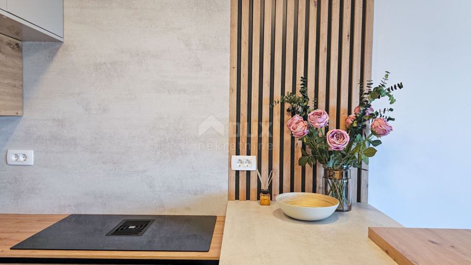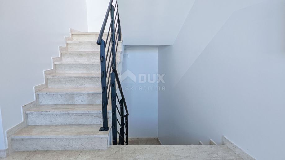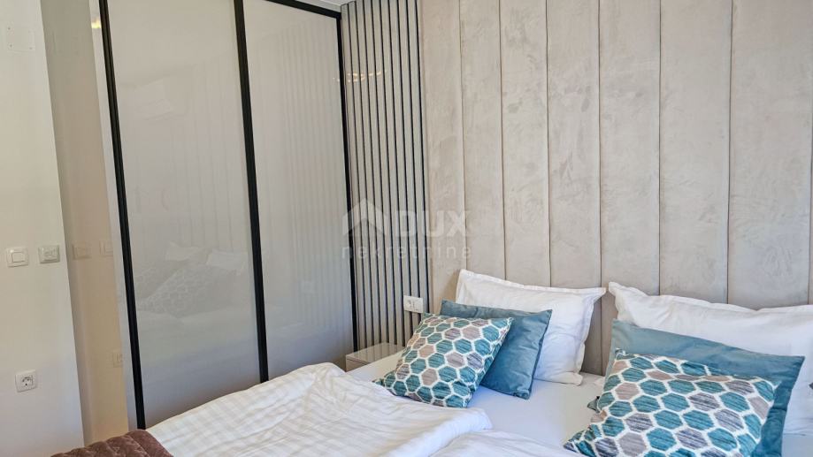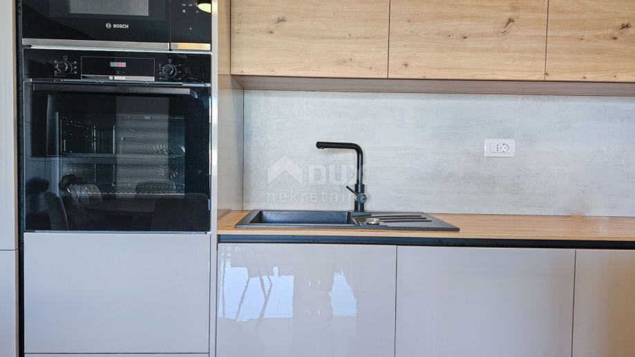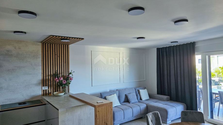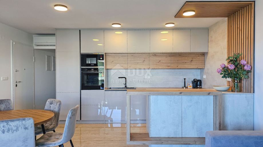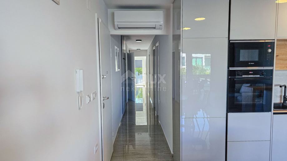 Apartman se sastoji od prostranog dnevnog boravka s kuhinjom i blagovaonom u open-space konceptu, tri luksuzno opremljene spavaće sobe, svaka s vlastitom kupaonicom, te dodatnog WC-a. Iz dnevnog boravka izlazi se na natkrivenu terasu od 15 m², idealnu za uživanje u pogledu na more i opuštanje uz jutarnju kavu.