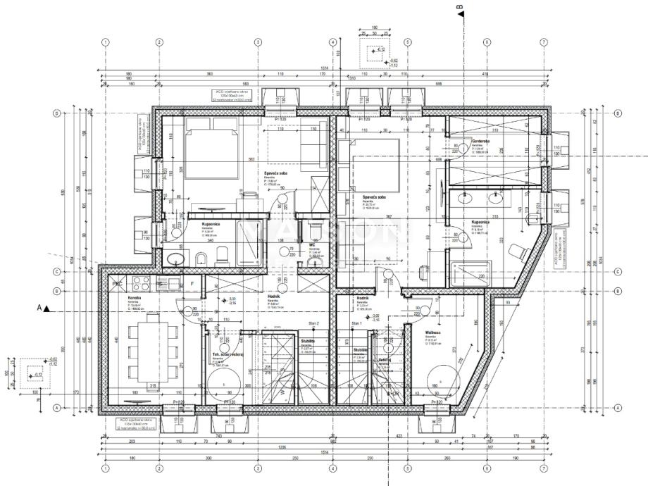 Posebna pažnja posvećena je stolariji – prozori i staklene stijene opremljeni su elektromotornim ALU roletama i komarnicima, a ulazna vrata su aluminijska protuprovalna. Unutarnja vrata bit će izrađena od punog drva, ugrađena elegantnom Inline tehnikom, s neutralnim kvakama njemačke proizvodnje. Terase, balkoni i stubište imat će sigurnosne staklene ograde.