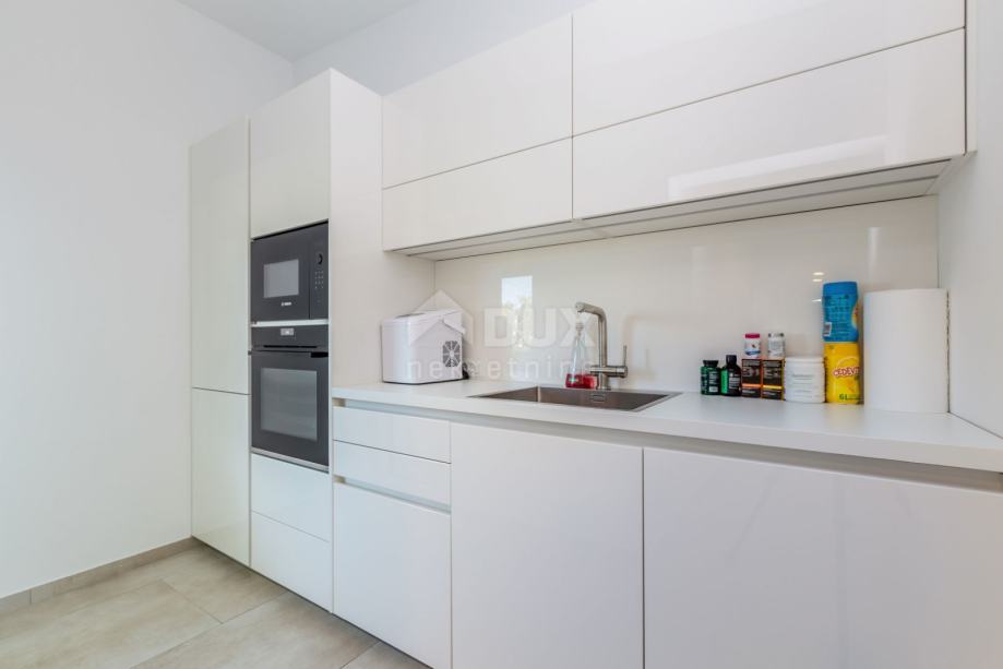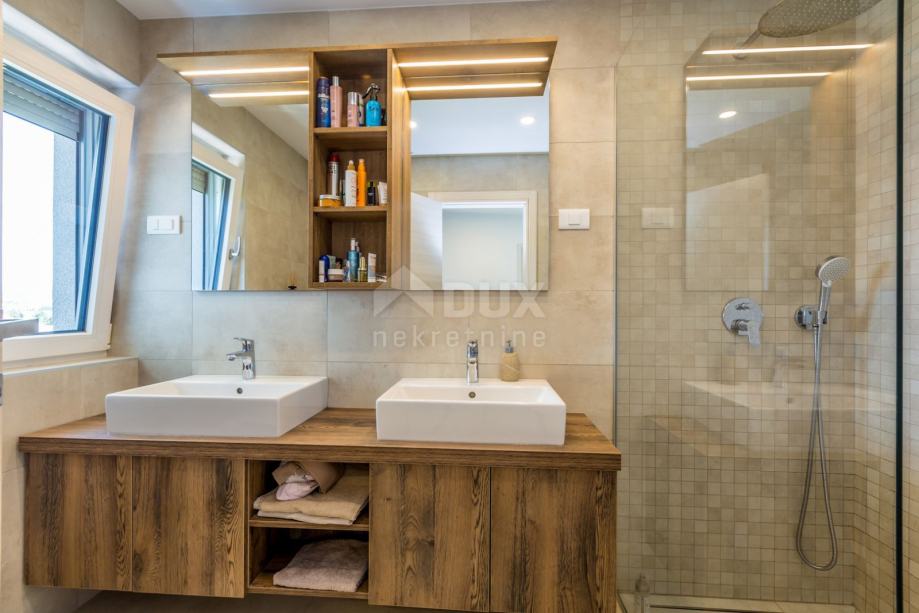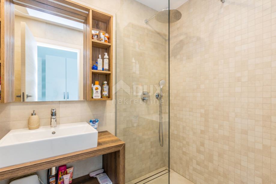 Sastoji se od tri spavaće sobe, tri kupaonice, velikog dnevnog boravka s blagovaonicom i kuhinje, te dva spremišta, WC, degažman i hodnik. Apartman u vlasništvu ima tri parkirna mjesta, te okoliš uz zgradu od 74 m2 koji se može urediti po želji. Posebnost ovog penthouse, svakako je bazen na terasi iz kojeg se pruža otvoreni pogled prema moru. Apartman je potpuno namješten i opremljen i sve u njemu ostaje budućem vlasniku.