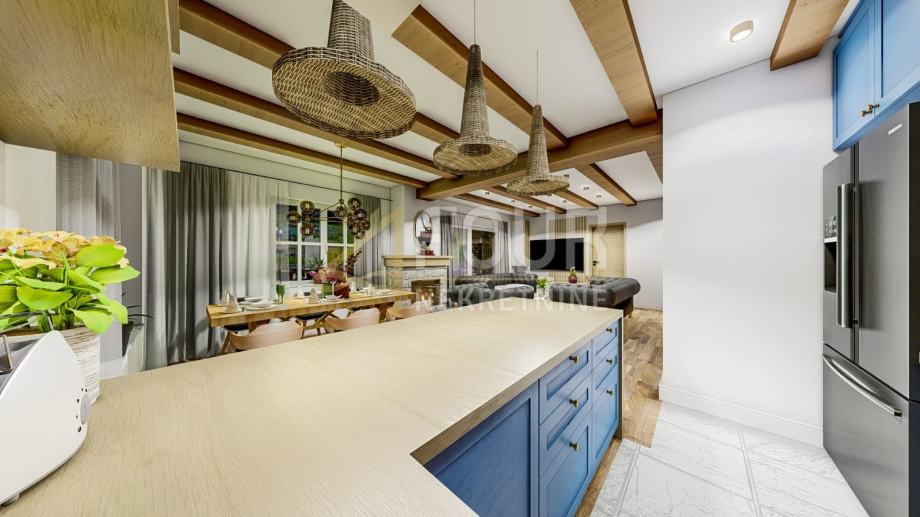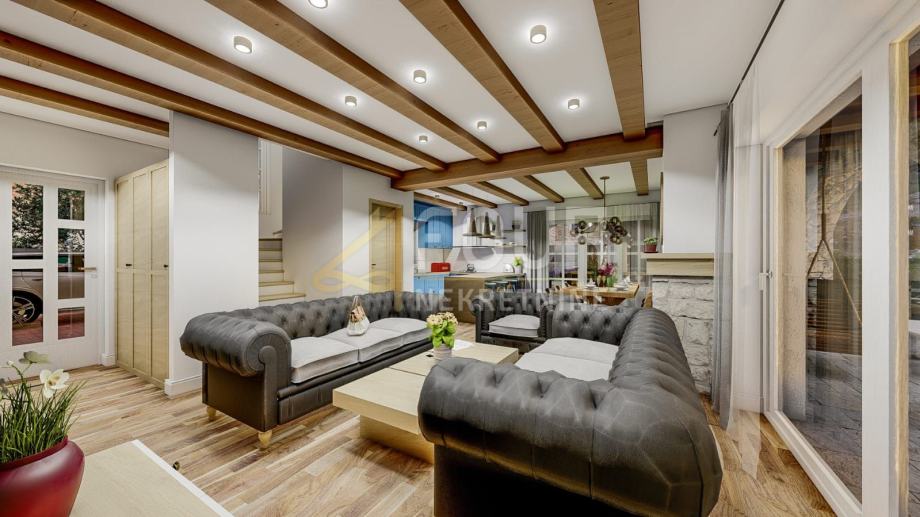 U prizemlju, koje obuhvaća 111 m2, nalazi se dnevni boravak s blagovaonicom i kuhinjom površine 43.46m2, s izravnim izlazom na natkrivenu terasu i okućnicu.