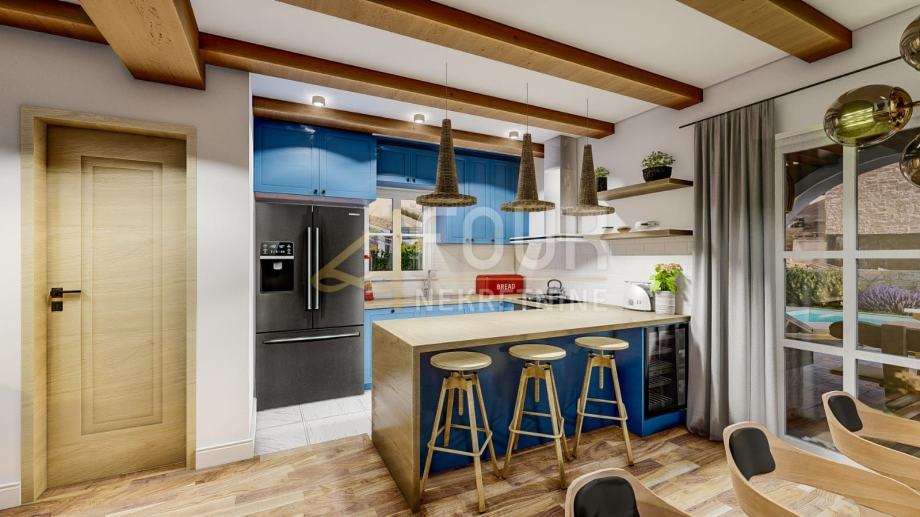 Izgrađena na parceli od 547m2, okružena je prostranom okućnicom od 400m2 koja uključuje bazen, vrt, vanjski roštilj, ljetnu kuhinju i vanjski tuš, što omogućava idealan prostor za uživanje na otvorenom.