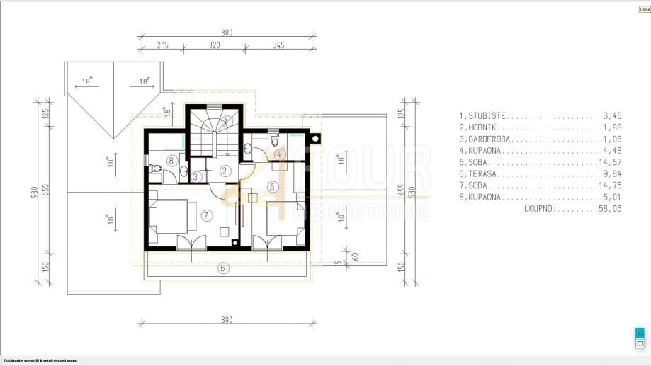 Na katu, površine 58.06 m2, smještene su dvije spavaće sobe, svaka s vlastitom kupaonicom i izlazom na balkon s pogledom na more, te garderobni prostor.