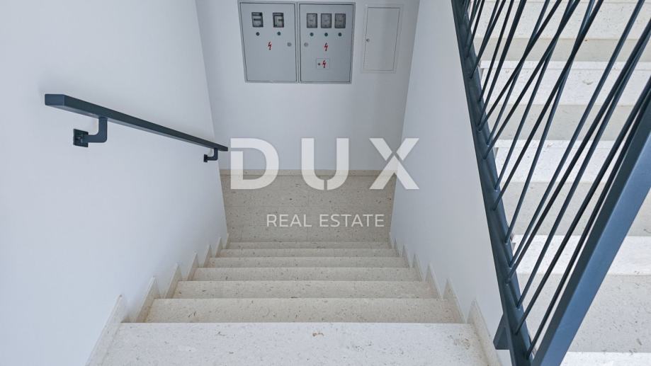 Na ulaznom dijelu stana od 88 m2 nalazi se kupaonica, moderno opremljena sa walk-in tušem, gostinjski toalet i predviđeno mjesto za garderobni ormar. U nastavku se nalaze dvije spavaće sobe opremljene klima uređajima. Dnevni dio je koncipiran kao open-space prostor te sadrži kuhinju, blagovaonicu i dnevni boravak. Stan ima loggiu i natkrivenu terasu s dva izlaza, a s terase se pruža prekrasan pogled na more.