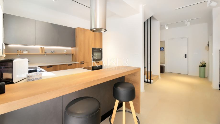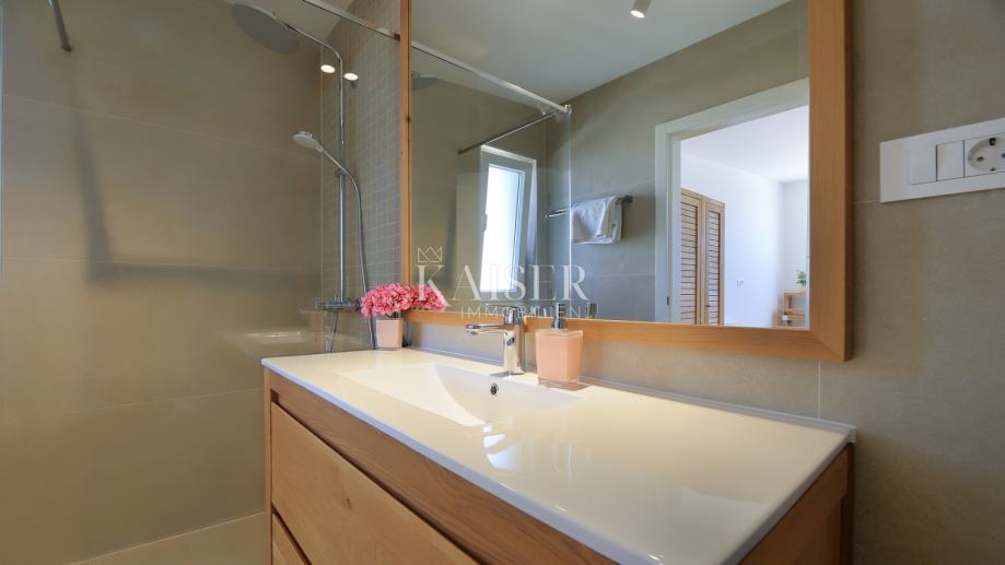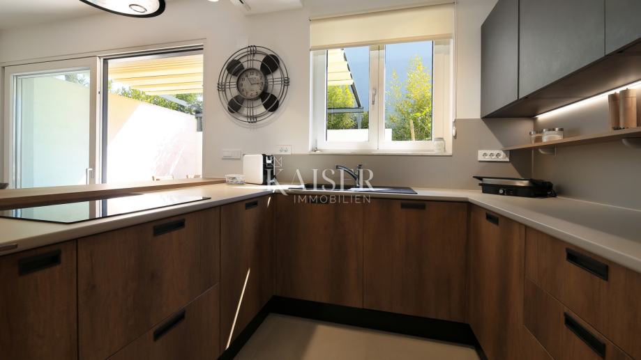 Kaiser Immobilien vam predstavlja modernu vilu ukupne stambene površine 211,95 m², smještenu na uređenoj okućnici od 453 m², s bazenom i pogledom na more koji se pruža s već prvoga kata. Ova elegantna nekretnina suvremenog dizajna prostire se na dvije etaže – prizemlje i kat te dva međukata. Ona savršeno spaja luksuz, funkcionalnost i vrhunsku kvalitetu gradnje.