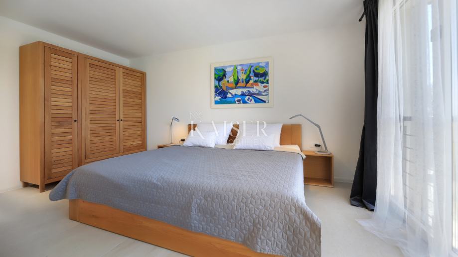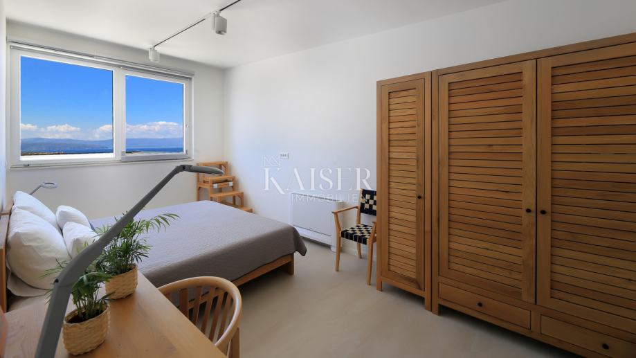 Na katu 108m², uključujući međukat, nalaze se četiri prostrane spavaće sobe površina od 16,04 m² do 20,25 m², svaka s vlastitom elegantnom kupaonicom. Dvije sobe imaju izlaz na prostranu krovnu terasu od približno 50 m² s panoramskim pogledom na Kvarnerski zaljev, pružajući savršeno mjesto za opuštanje uz zalazak sunca. Na obje etaže nalaze se dodatne ostave koje osiguravaju praktičan prostor za pohranu.
