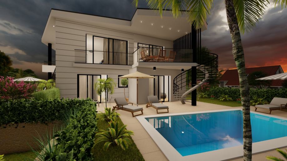 Na gornjoj etaži prostire se prozračan open space koji uključuje kuhinju, blagovaonicu i dnevni boravak, a iz kojeg se izlazi na natkrivenu terasu. Kružnim stepenicama s terase moguće je sići u pažljivo uređenu okućnicu s privatnim bazenom i sunčalištem – idealnim za opuštanje tijekom ljetnih mjeseci.