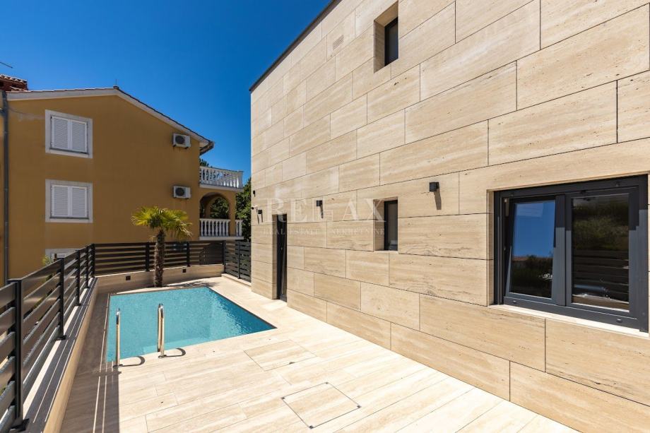 Na otoku Krku, Malinska na atraktivnoj lokaciji u luksuznom objektu sa tri etaže prodajemo trosobni luksuzni apartman na prvom katu sa vlastitim bazenom.