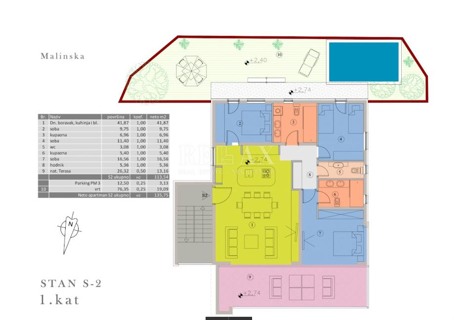 Apartmanu pripada i dio privatne okućnice sa vlastitim bazenom te jedno parkirno mjesto.