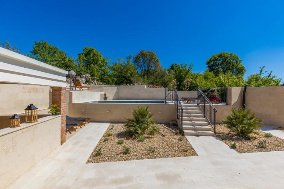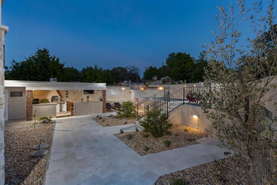 Poseban ugođaj stvara lijepo uređena okućnica površine 445 m² s grijanim bazenom sa slanom vodom, vanjskim tušem i toaletom, kao i natkrivenom ljetnom kuhinjom s roštiljem – savršenom za druženja na otvorenom. Dva spremišta i privatni parking za dva vozila dodatno doprinose funkcionalnosti.