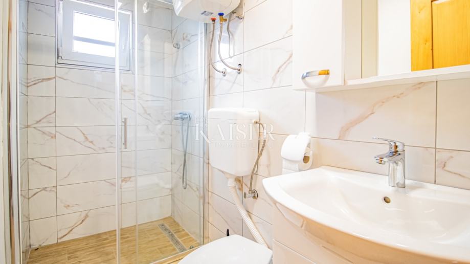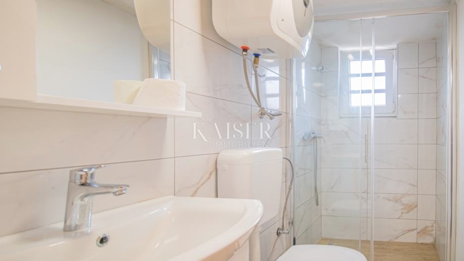 U prizemlju se nalazi apartman stambene površine iznosi 60m2, sastoji od ulaznog prostora, jedne spavaće sobe, dnevnog prostora koji uključuje boravak i blagovaonicu, kuhinje i kupaonice.