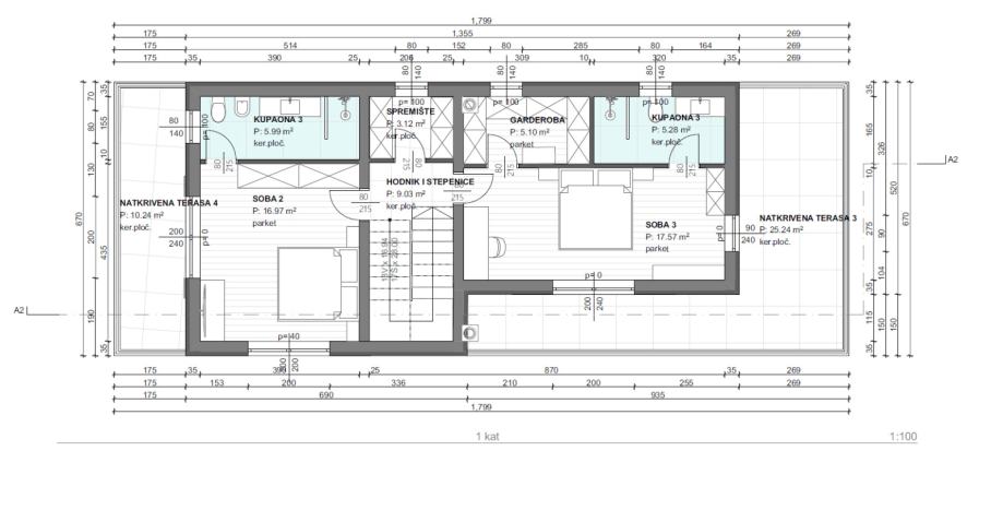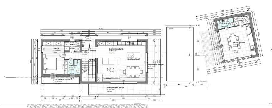 Na katu se nalaze dvije prostrane spavaće sobe, svaka s vlastitom kupaonicom i balkonom, dodatni hodnik te još jedna ostava. Odvojeno od glavne zgrade, nekretnina uključuje i posebno osmišljeni pomoćni prostor površine 30 m² s ljetnom kuhinjom, roštiljem, tehničkom sobom i dodatnim WC-om. Riječ je o visoko funkcionalnom i atraktivnom sadržaju koji predstavlja istinsku dodanu vrijednost, savršen za druženja i opuštanje tijekom cijele godine.