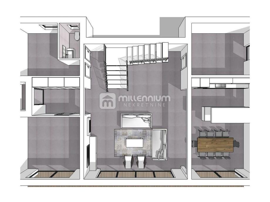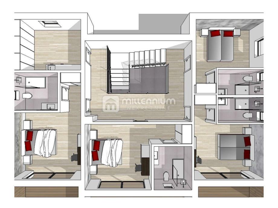 U prizemlju se nalazi dnevni dio, a na katu su smještene 4 spavaće sobe s vlastitim kupaonicama.
